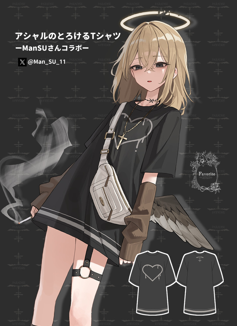 オーバーサイズ ゆったり 黒T プリントT 男女兼用 ユニセックス モード クール 天使 ハート*Favorite*ManSUさんコラボグッズ アシャルのとろけるTシャツ【2025年9月下旬予約開始】