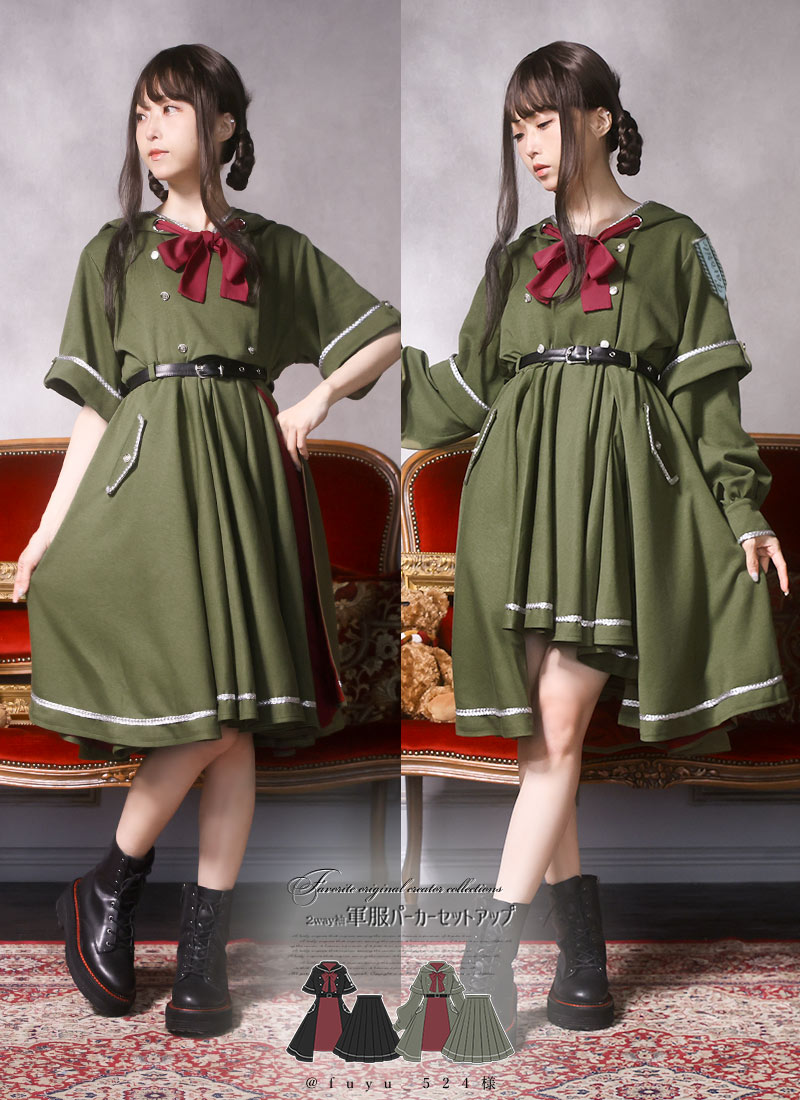 【最短即日出荷】軍服 パーカー スカート ミリタリー 半袖 長袖 ミディアム ミニ ダブルボタン*Creator Collection*2Way袖軍服パーカーセットアップ【2025年4月上旬予約開始】