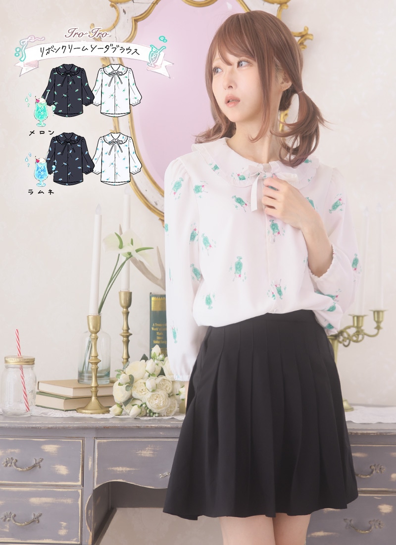 【最短即日出荷】メロン ラムネ クリームソーダ レトロ メロンソーダ 夏 フリル 七分袖 リボン*Favorite*リボンクリームソーダブラウス【2025年5月下旬予約開始】