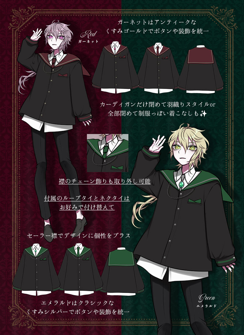 ・「ガーネット」はアンティークなくすみゴールド、「エメラルド」はクラシックなくすみシルバーでボタンや装飾を統一
