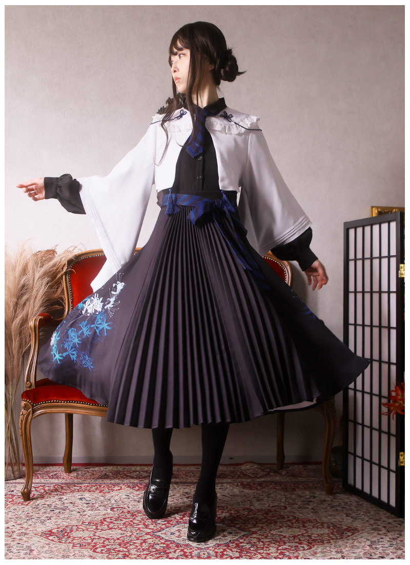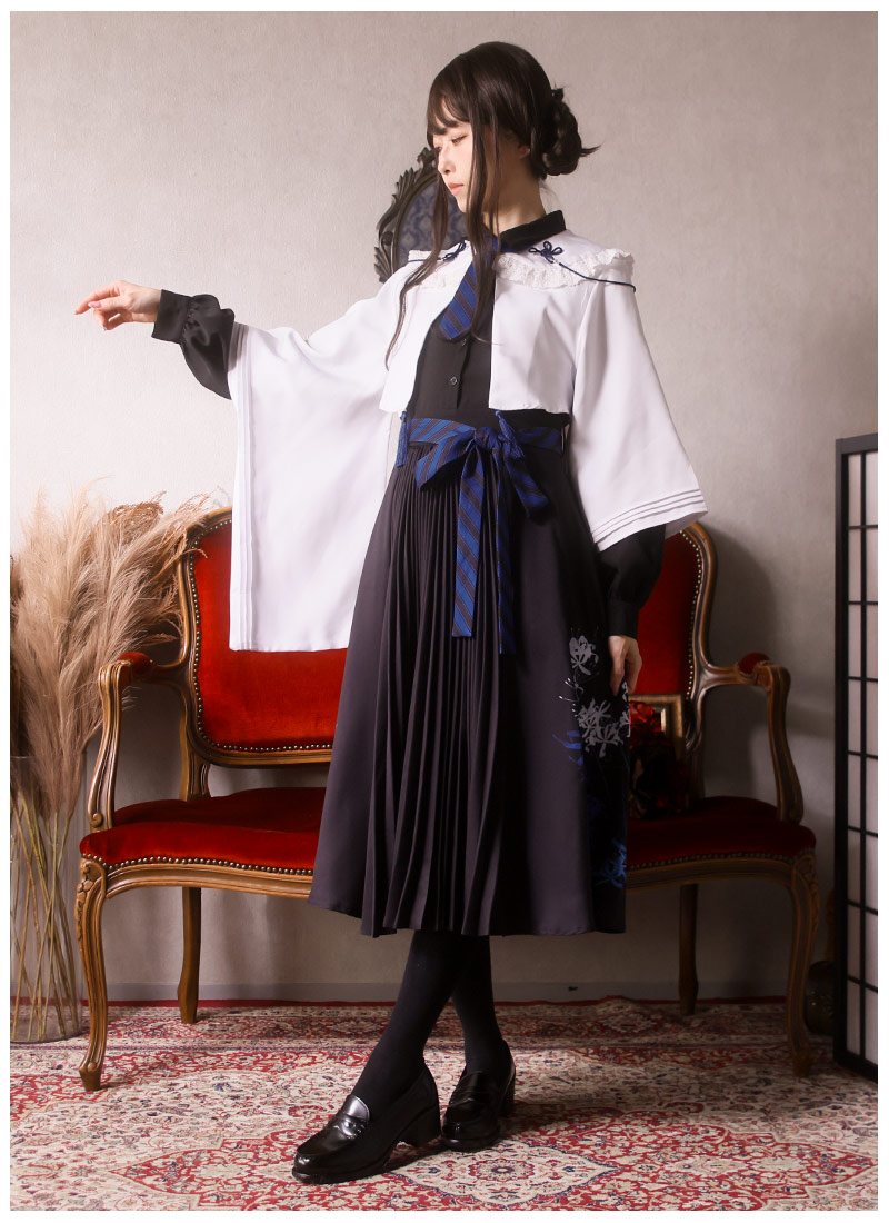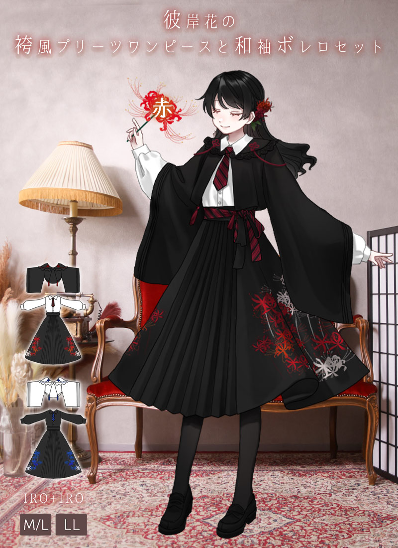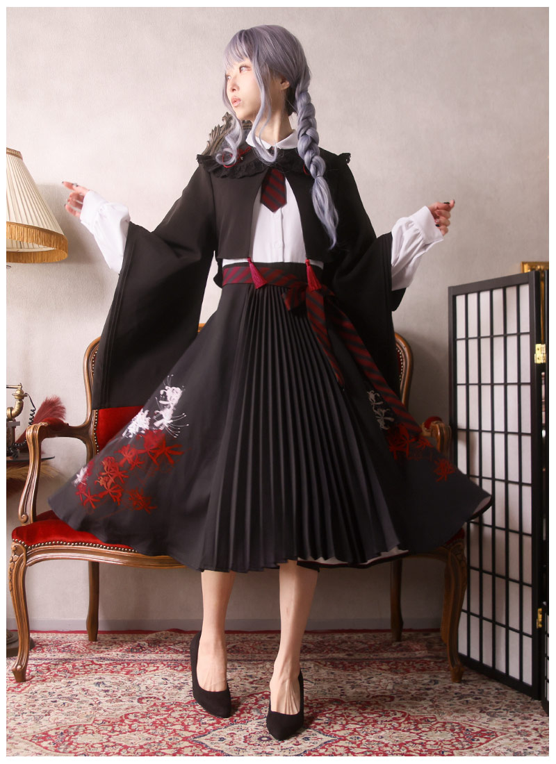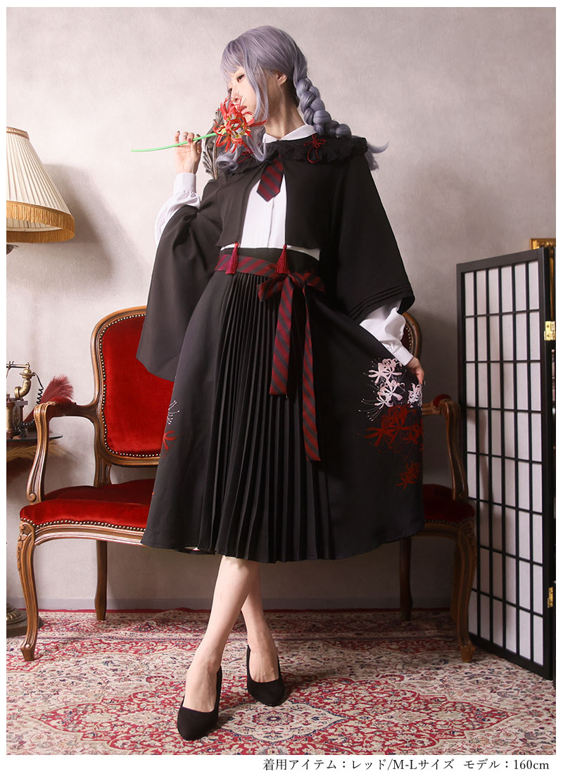 彼岸花の袴風プリーツワンピースと和袖ボレロセット