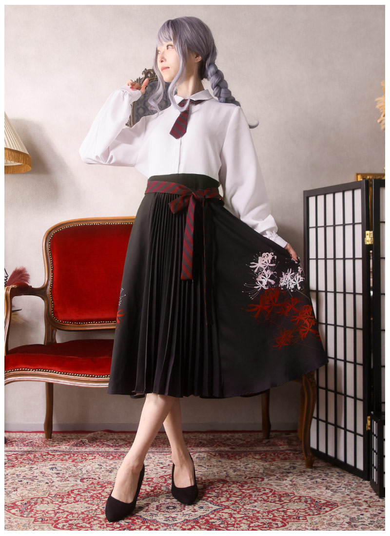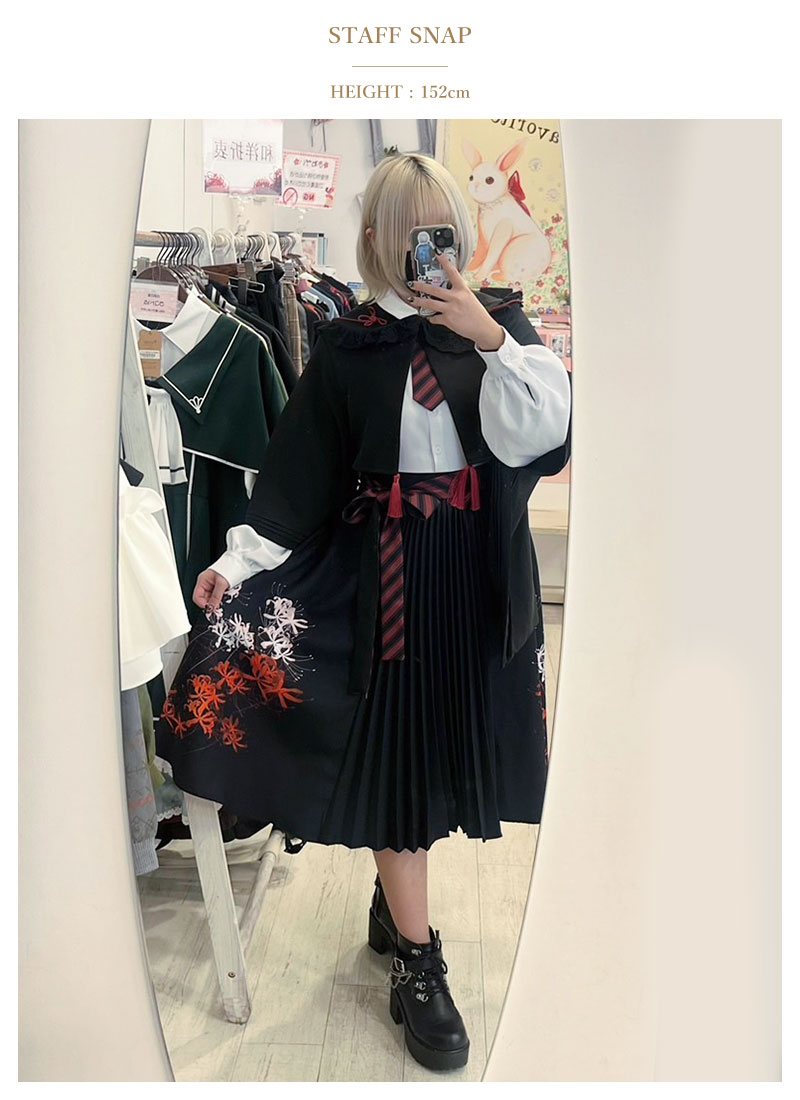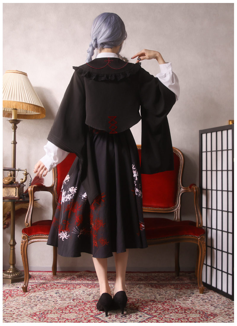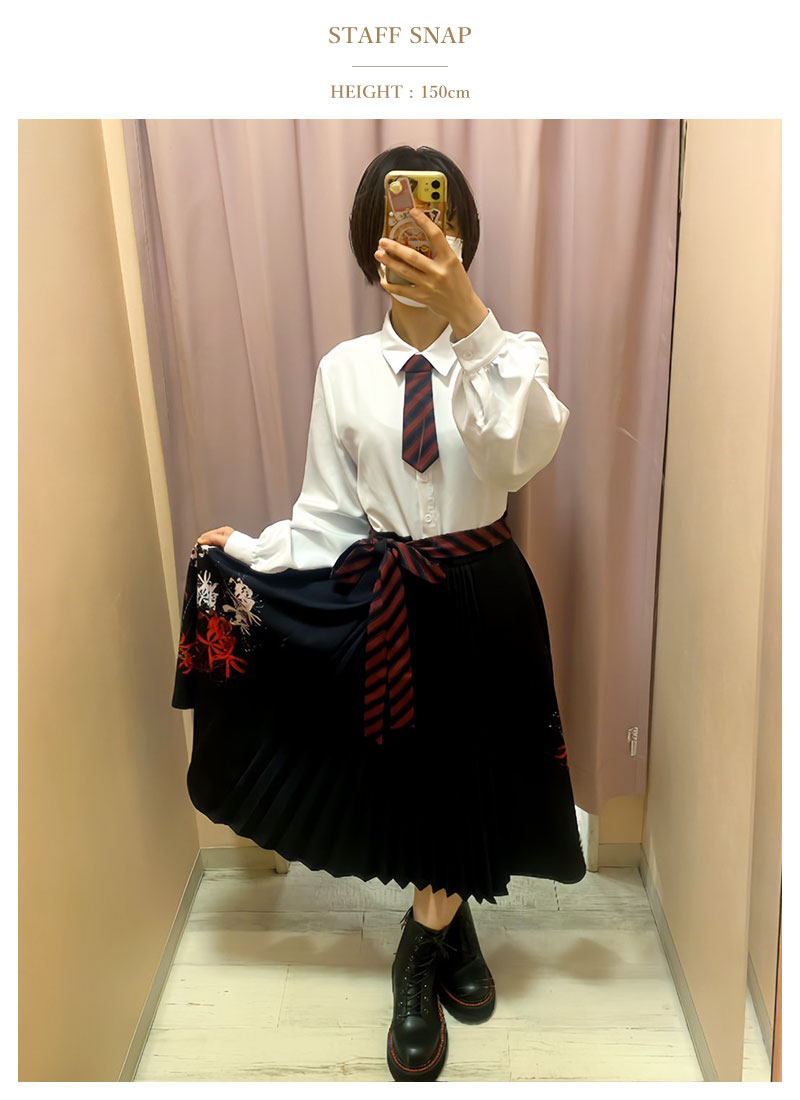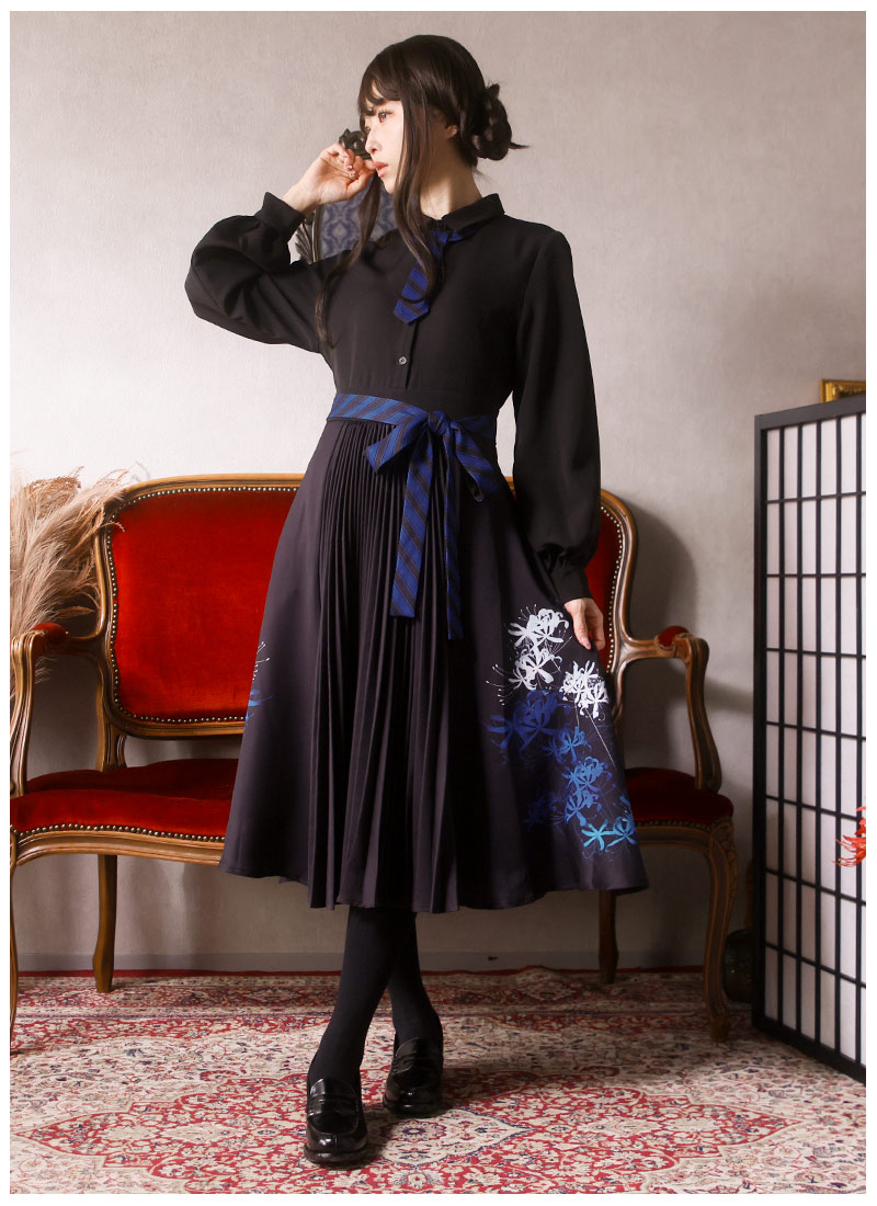 黒地のスカートに咲く、可憐で儚い鮮やかな彼岸花プリントがポイント