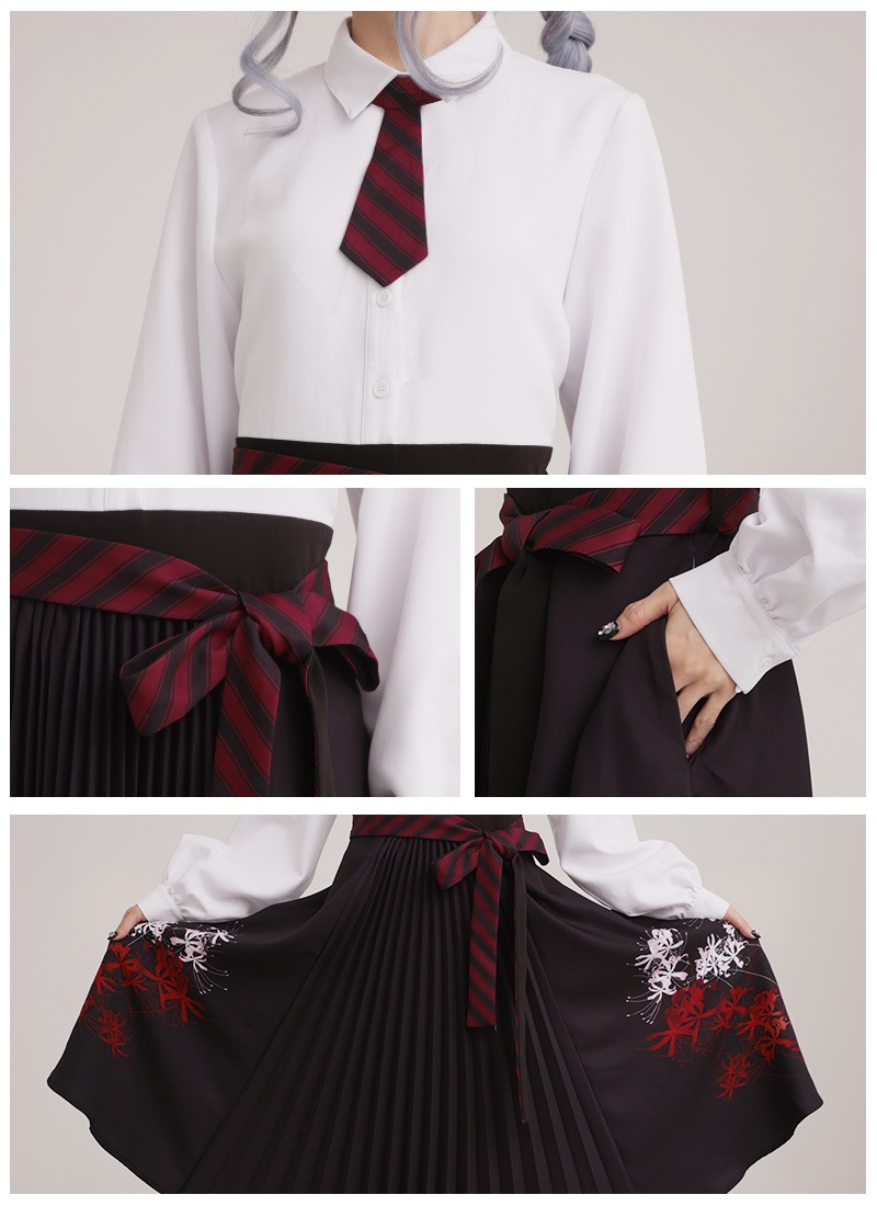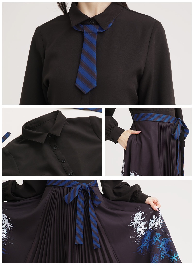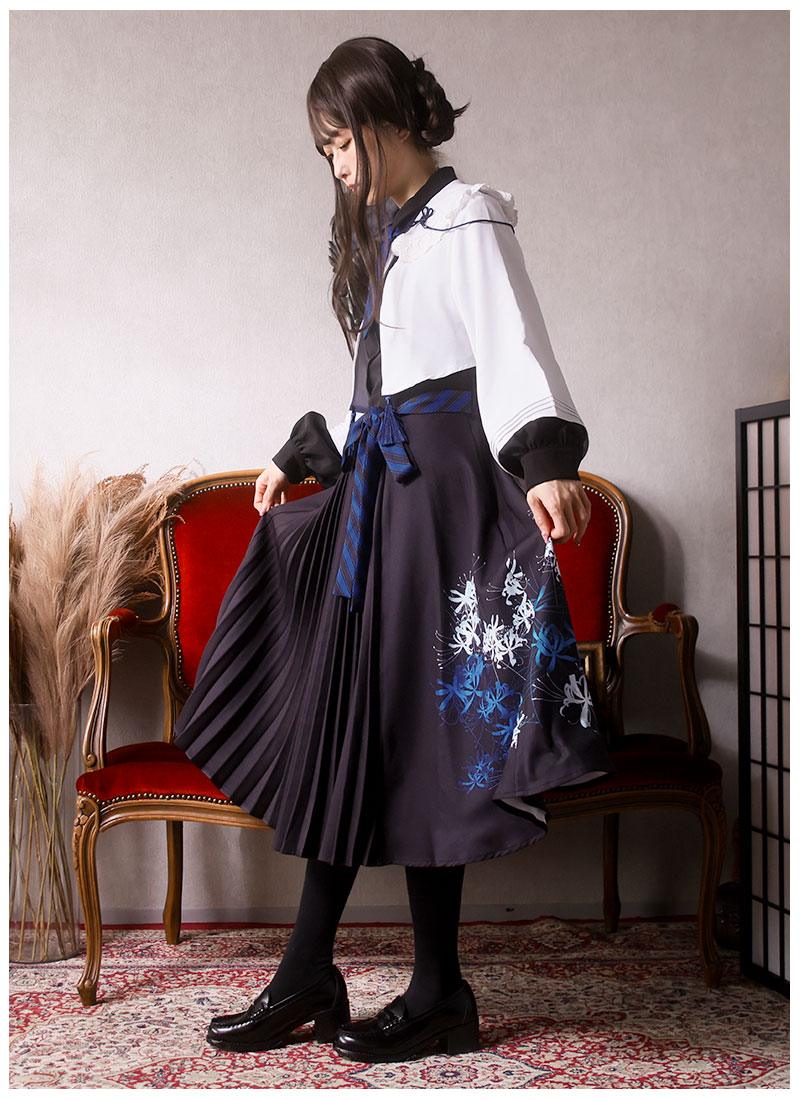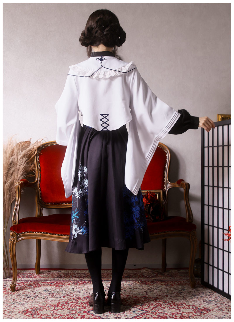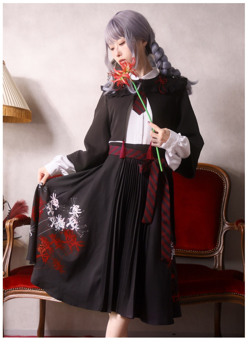 黒地のスカートに咲く、可憐で儚い鮮やかな彼岸花プリントがポイント