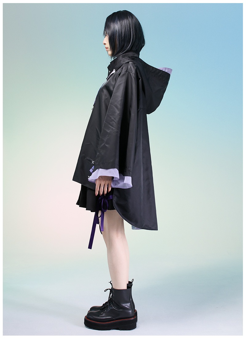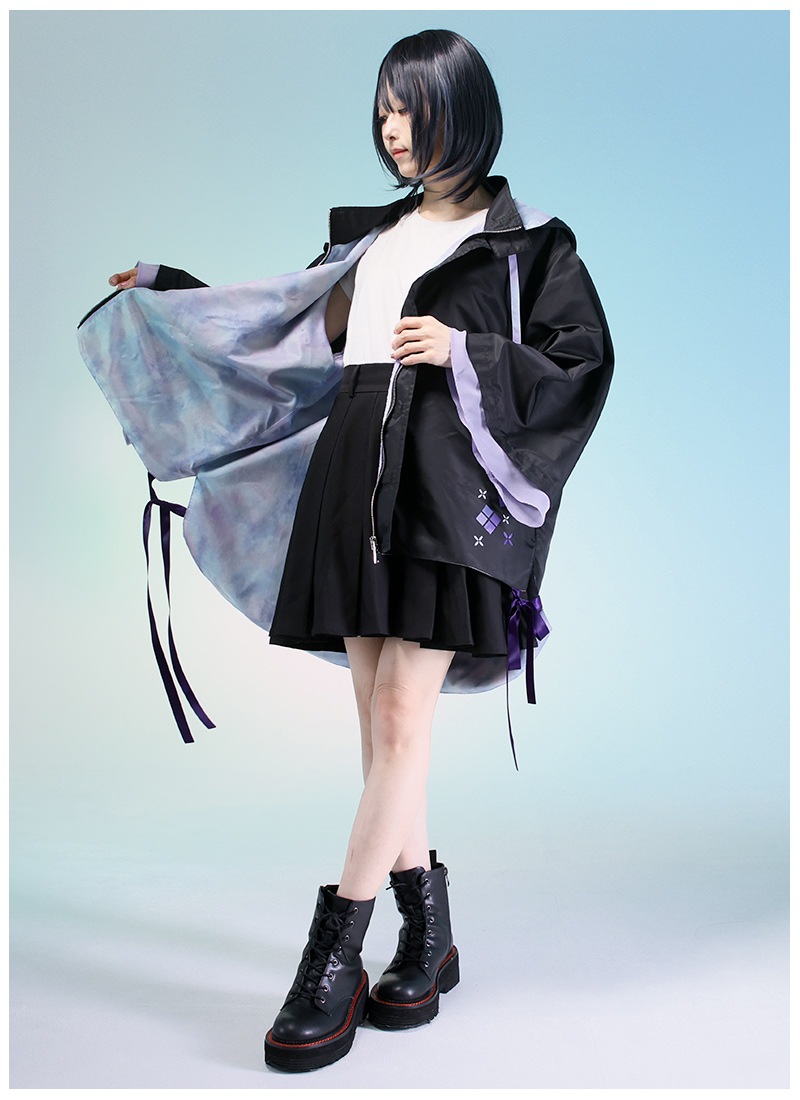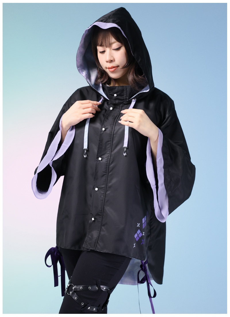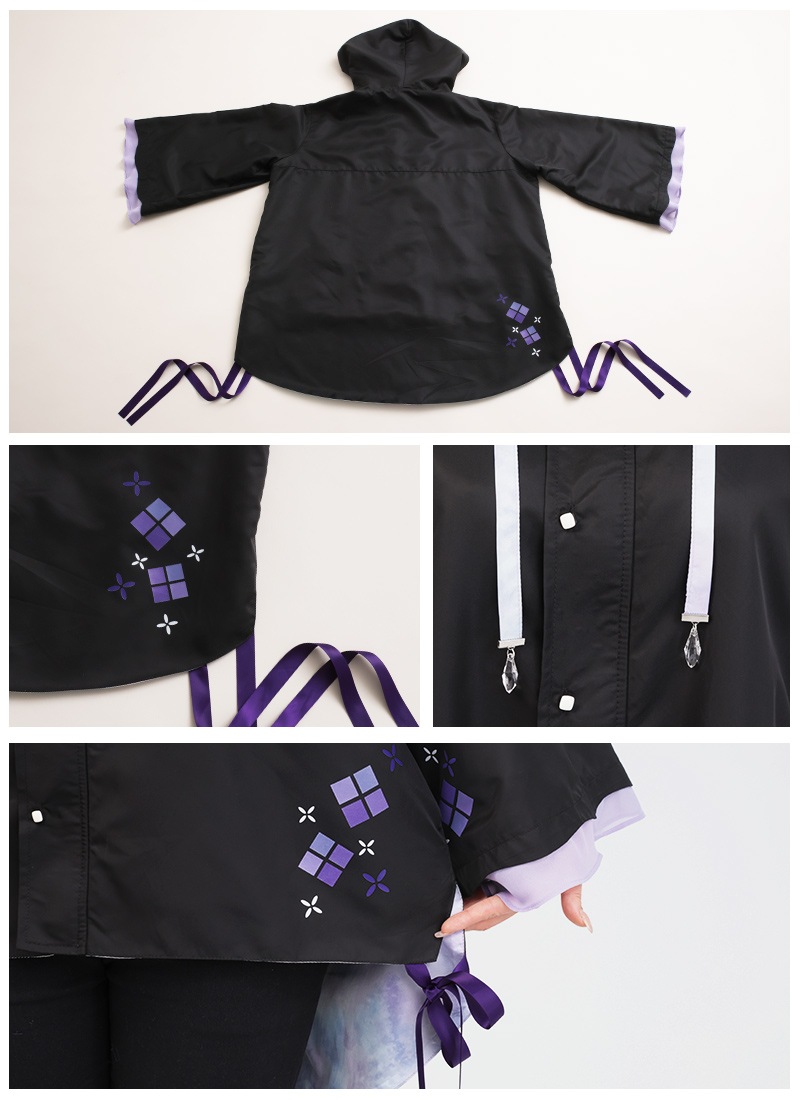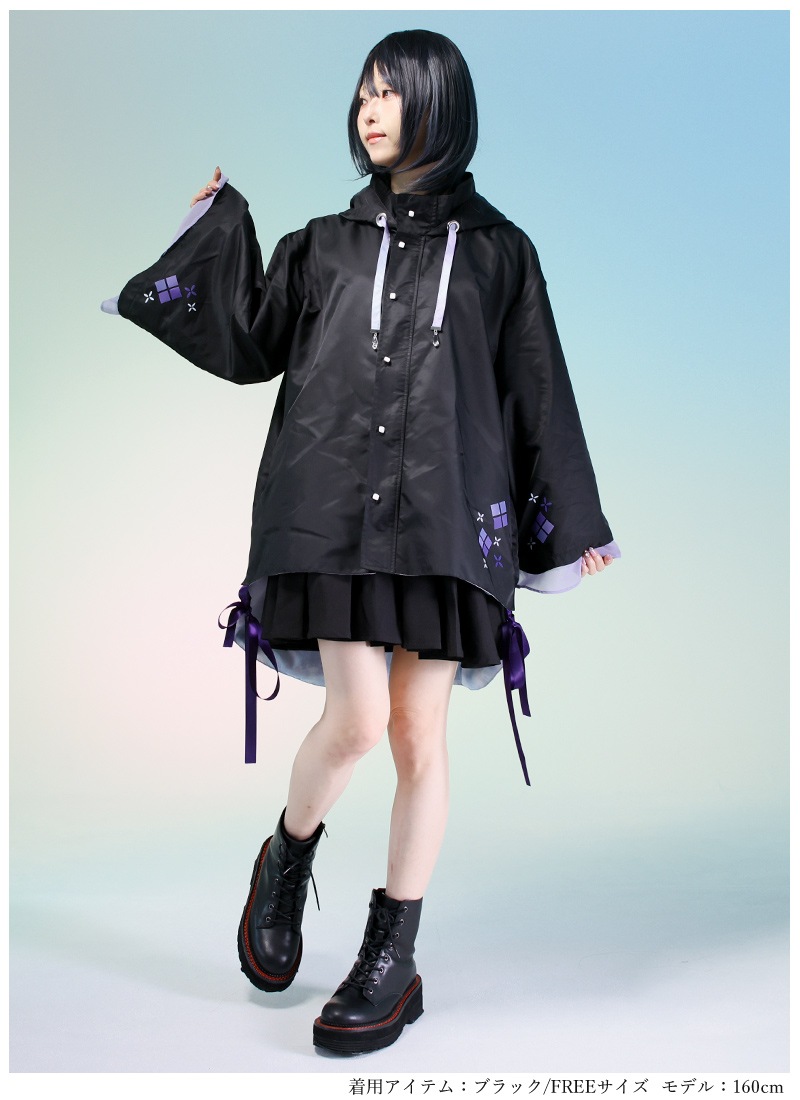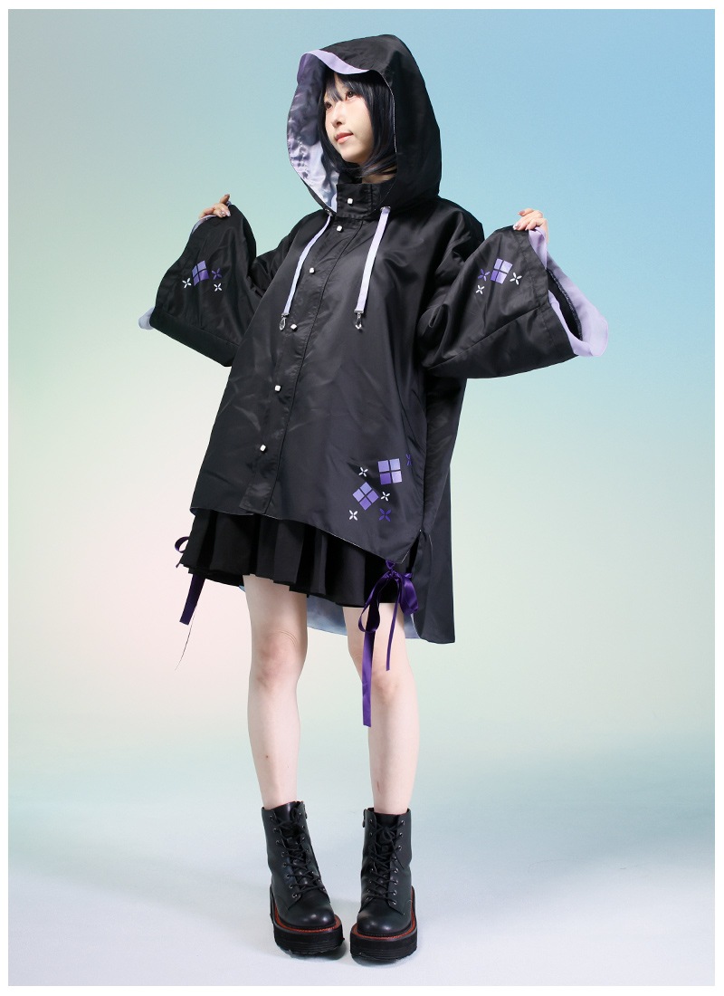 フードやフィッシュテールから見える紫陽花カラー裏地が美しい。