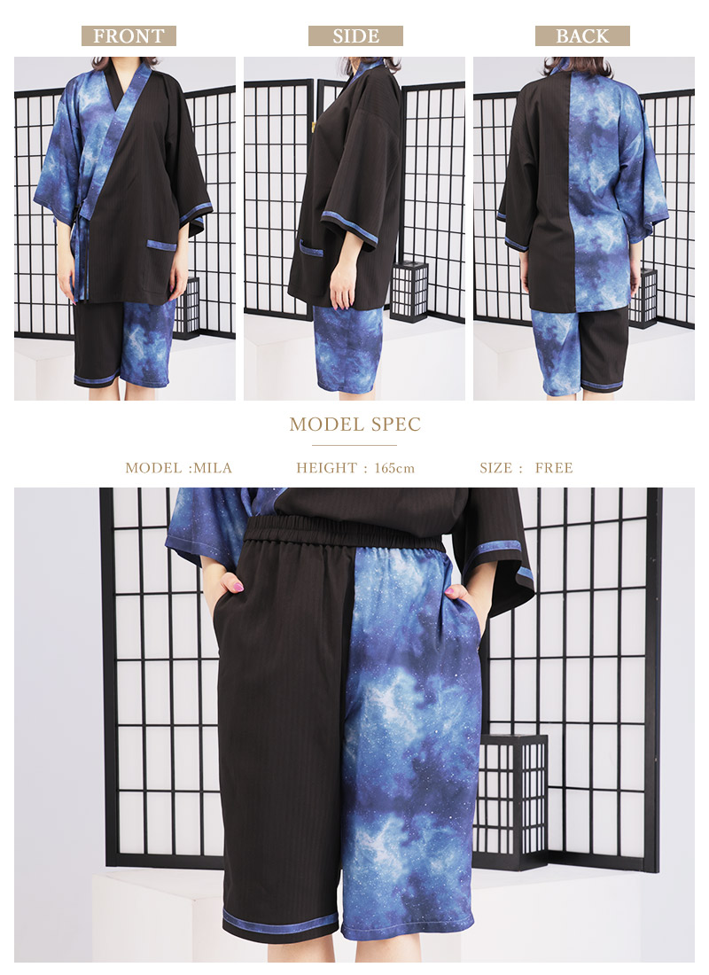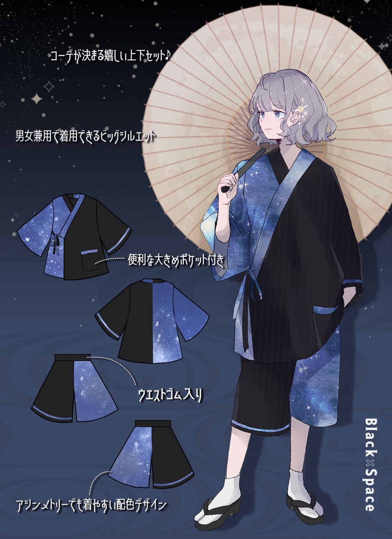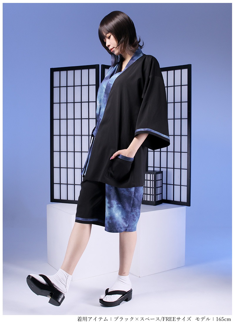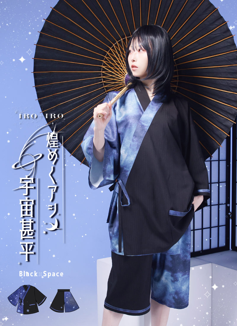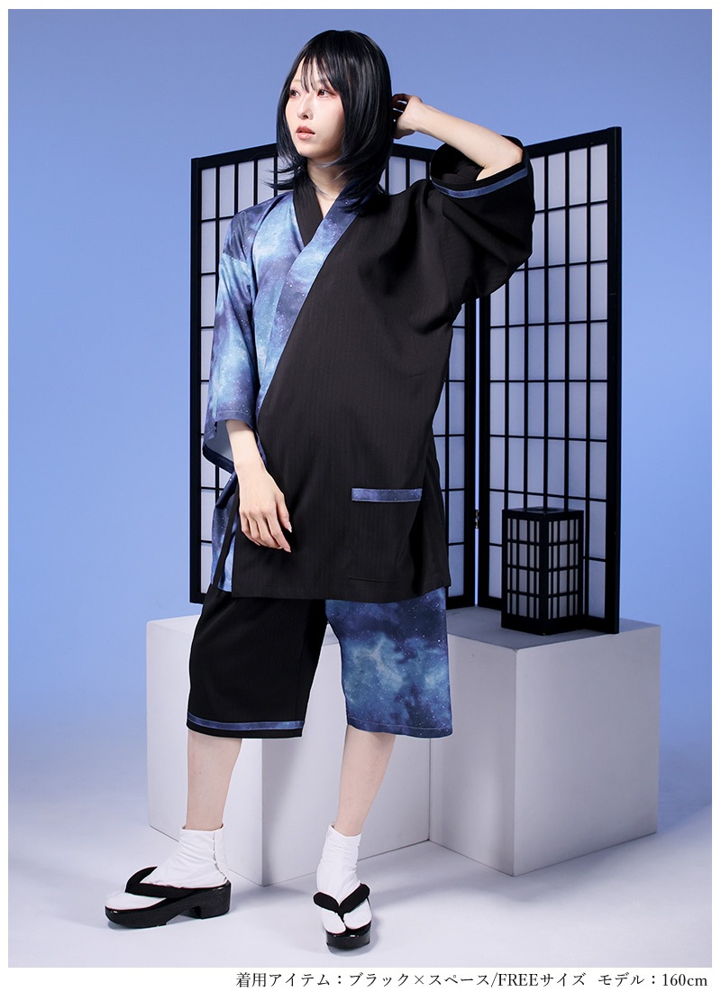 アシンメトリーに入った宇宙柄が存在感抜群な甚平セット