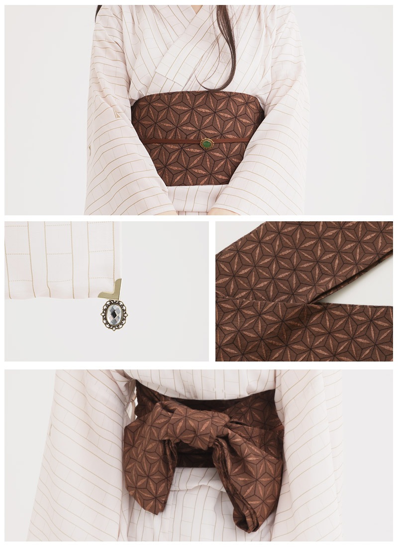 寄木細工風プリントの帯にグリーンの宝石帯飾りが映える