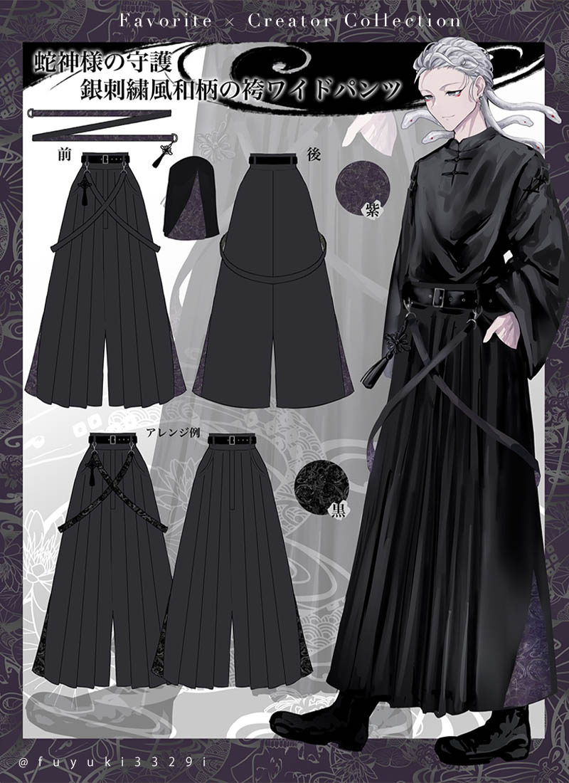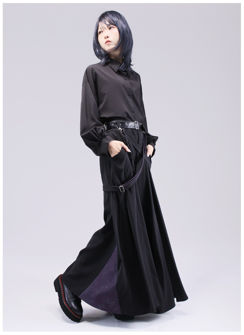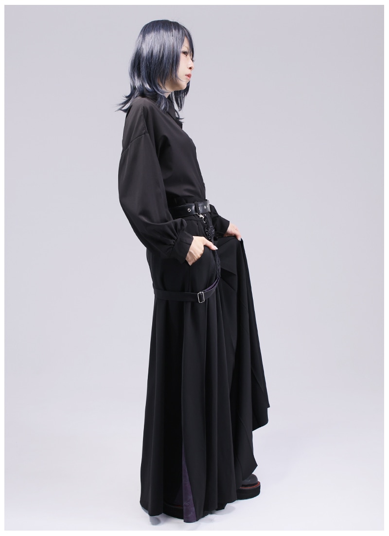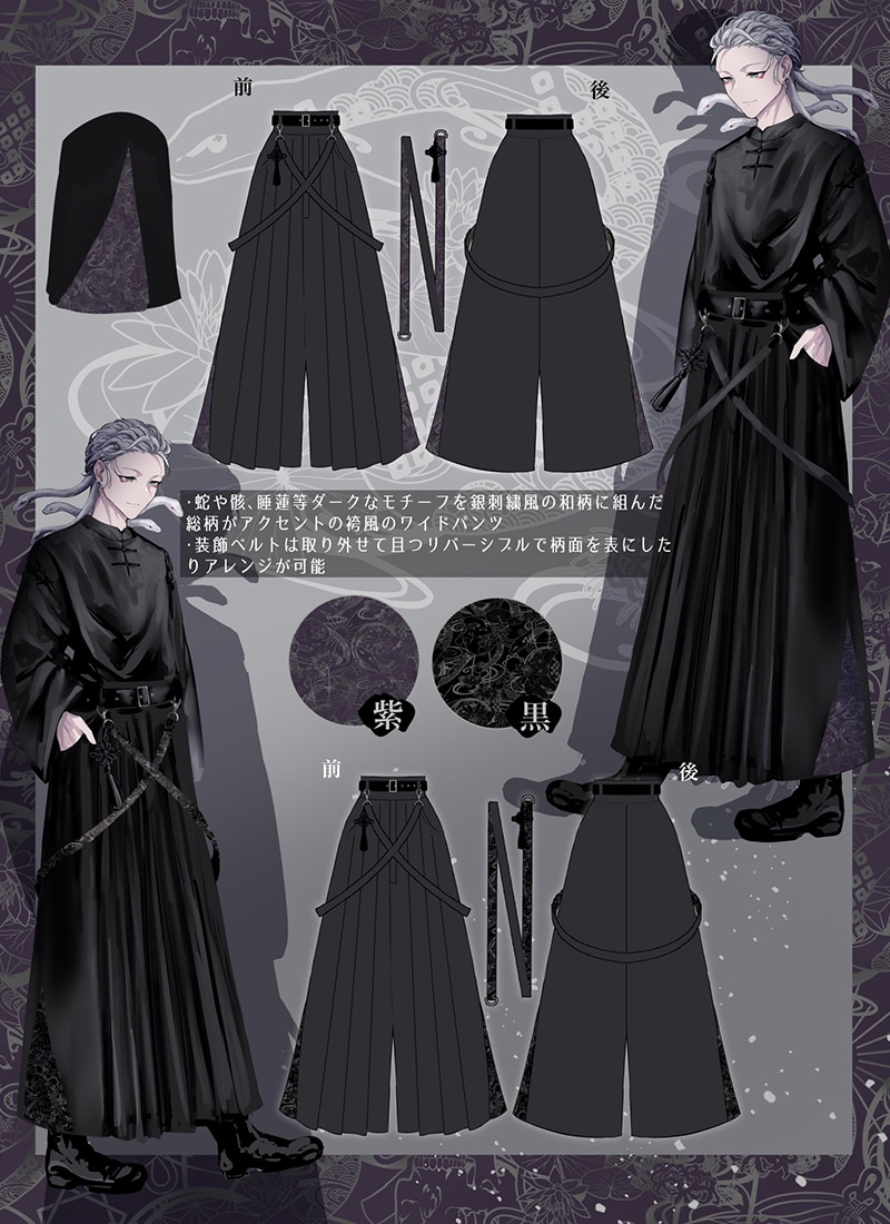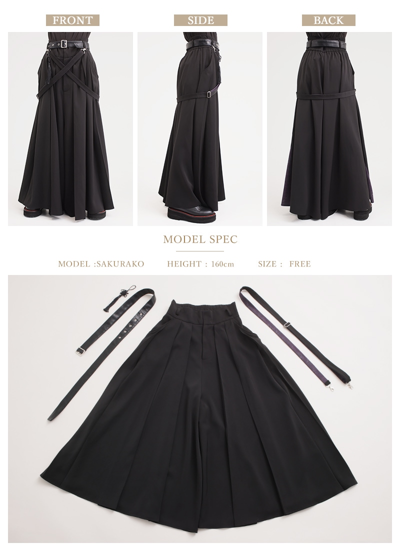 サイドや装飾ベルトにオリジナル和柄があしらわれた袴風ワイドパンツ