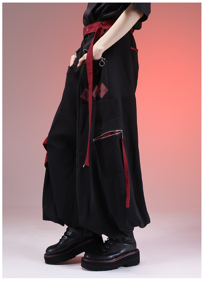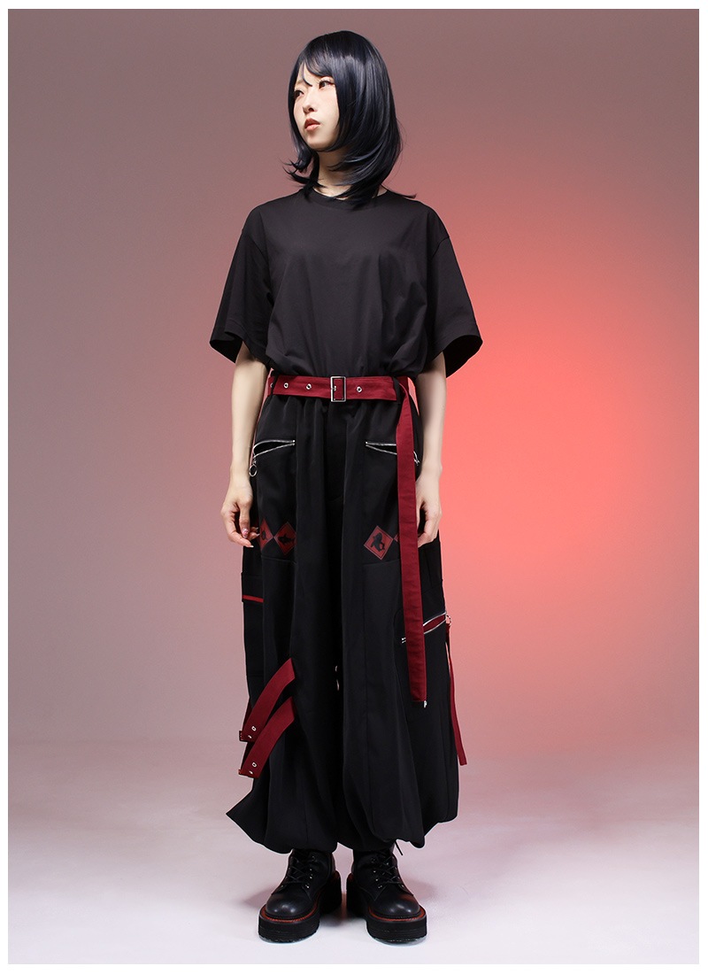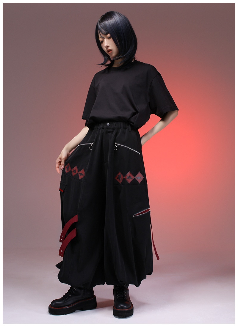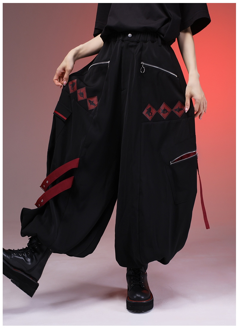 飛び出し注意の警告標識をプリント&差し色として取り入れたカーゴパンツ