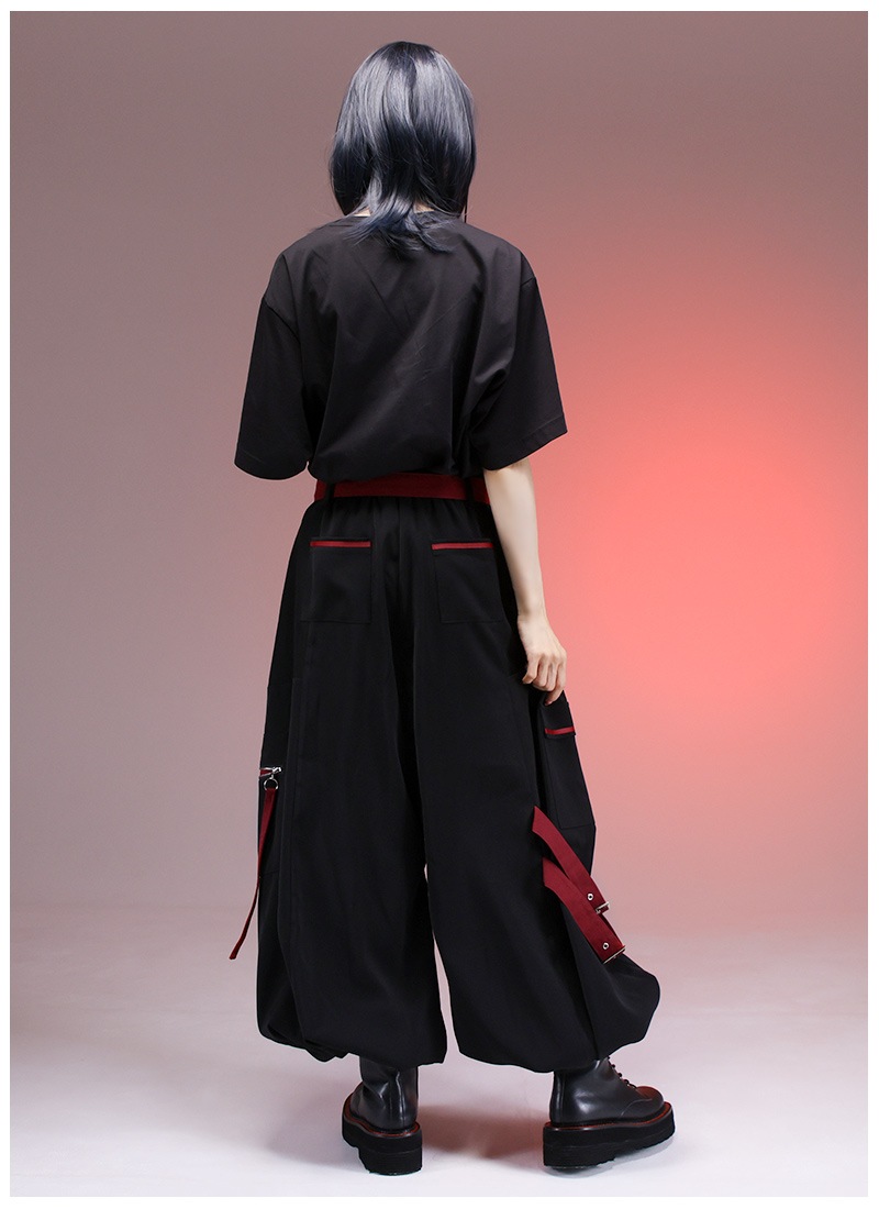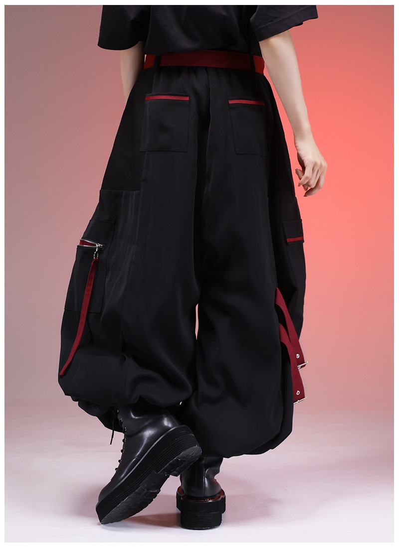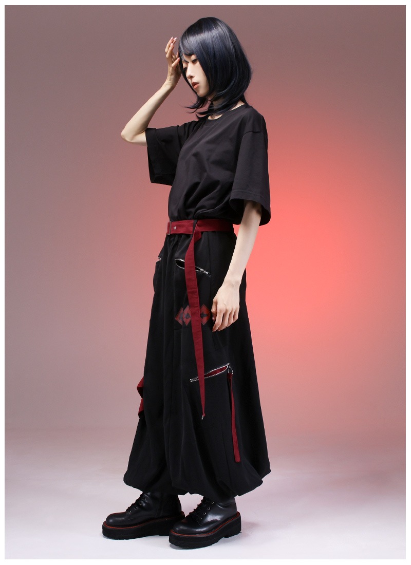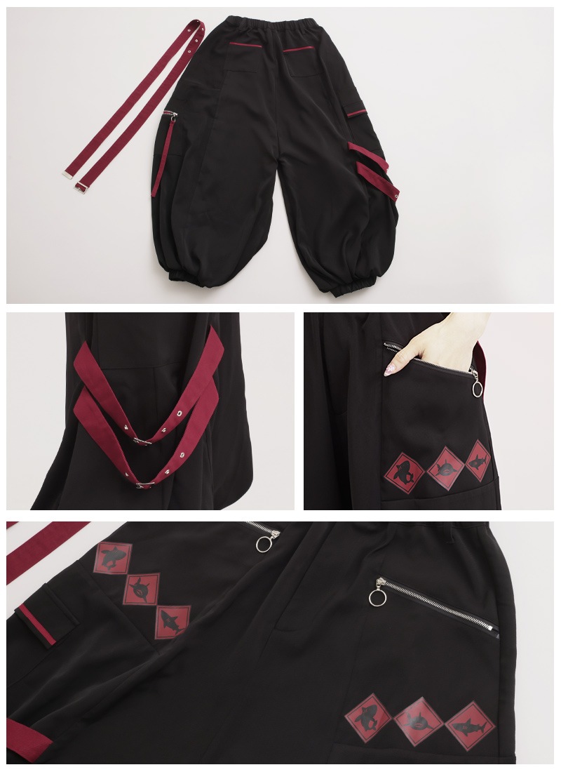飛び出し注意の警告標識をプリント&差し色として取り入れたカーゴパンツ