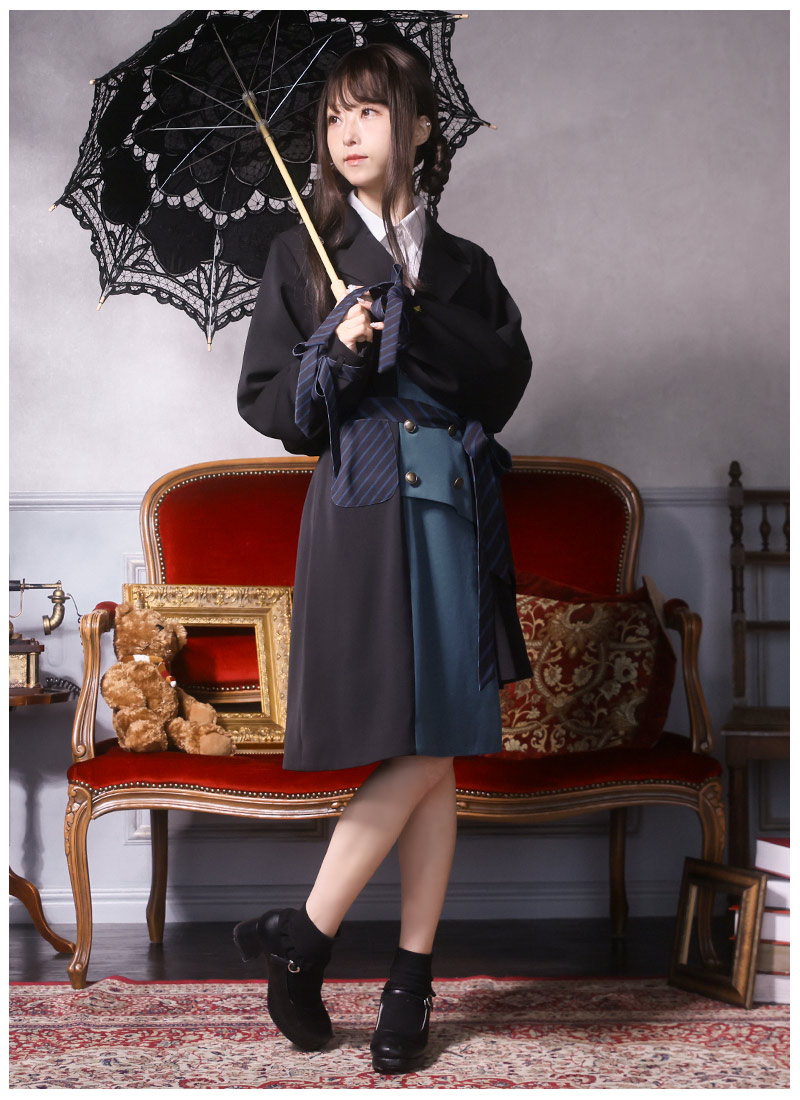 アンティークゴールドのダブルボタンとポイント使いのストライプで気品ある印象に。