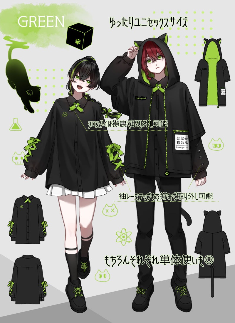 ビビットな差し色が目を引く猫耳パーカー&レースアップシャツの2点セット