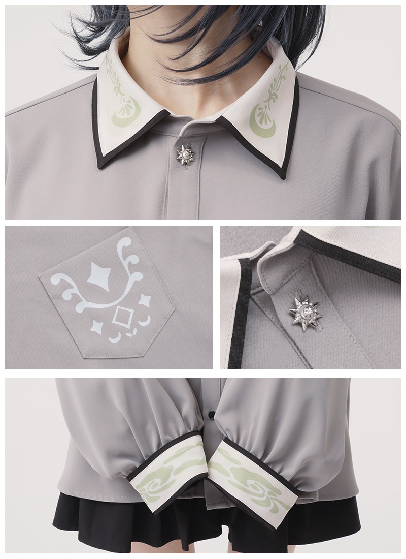 ・襟やカフスにクラシカルなプリントのあしらい