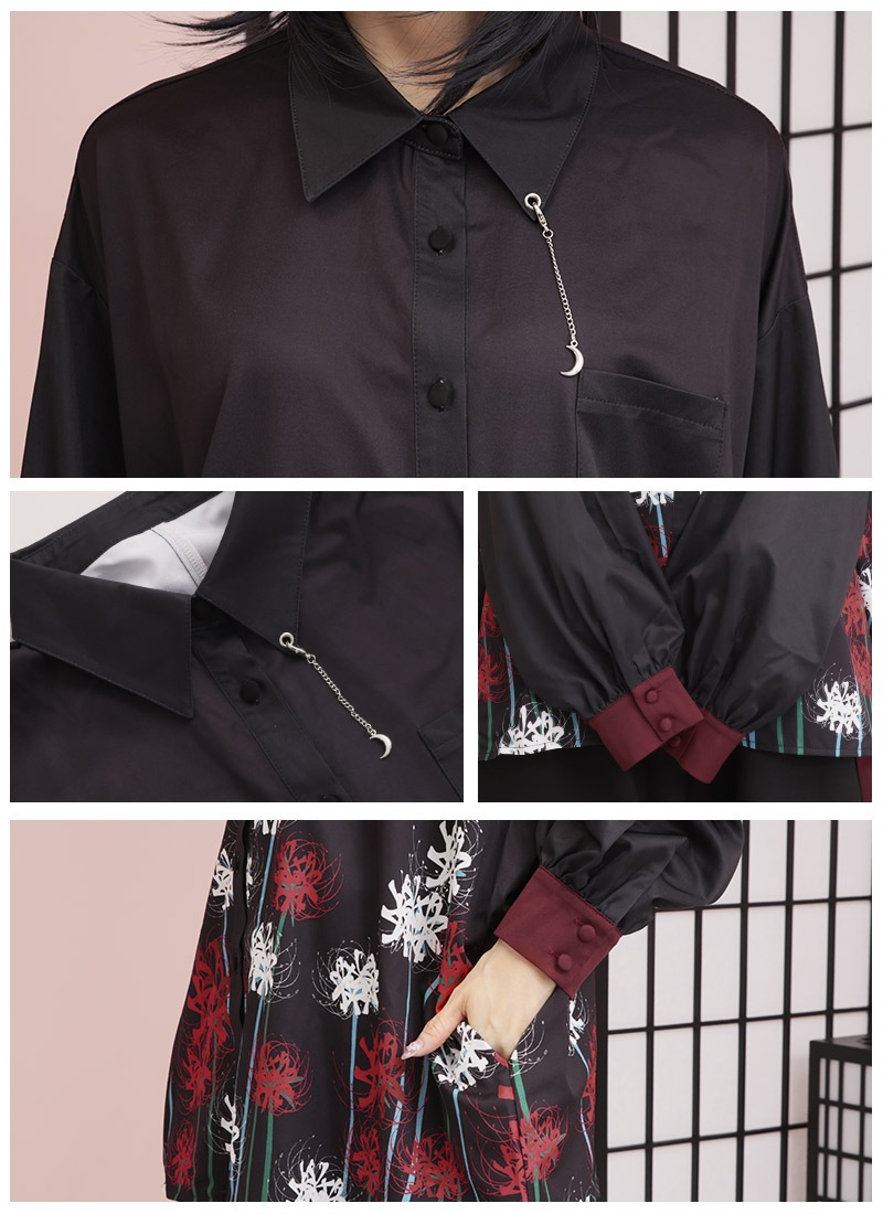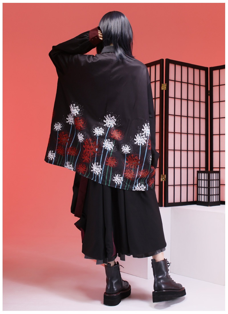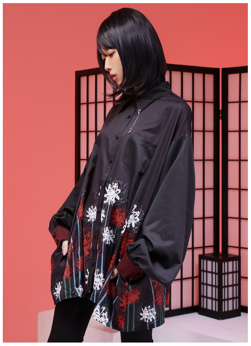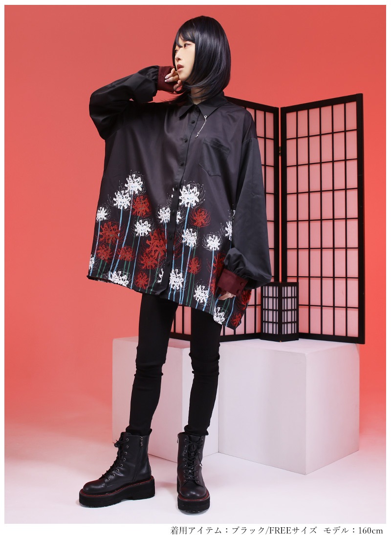 ぐるりと一面に広がる大きな彼岸花プリントのシャツはセットのパンツだけでなくスキニーパンツとも相性◎