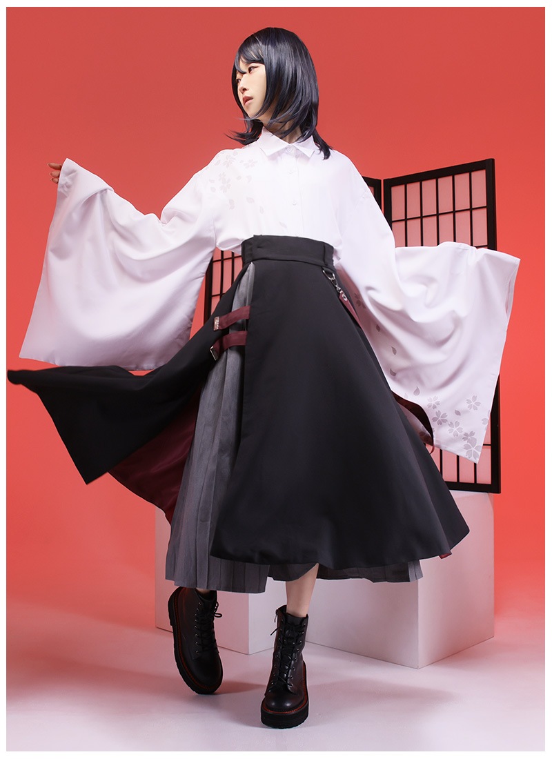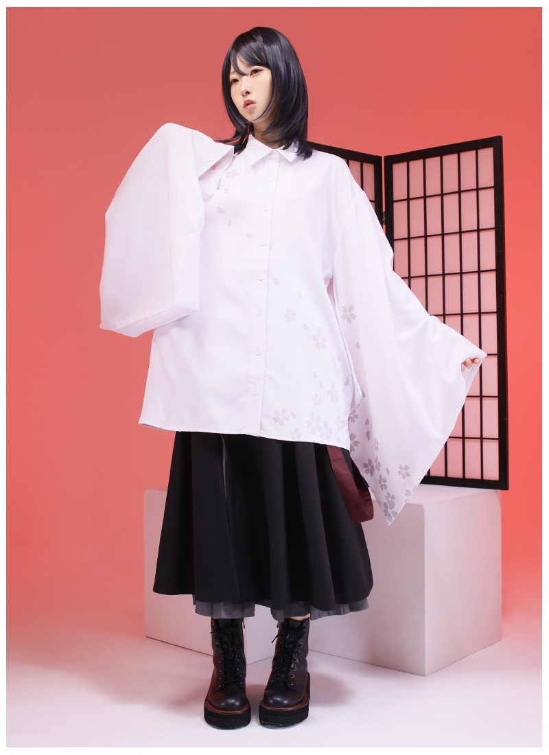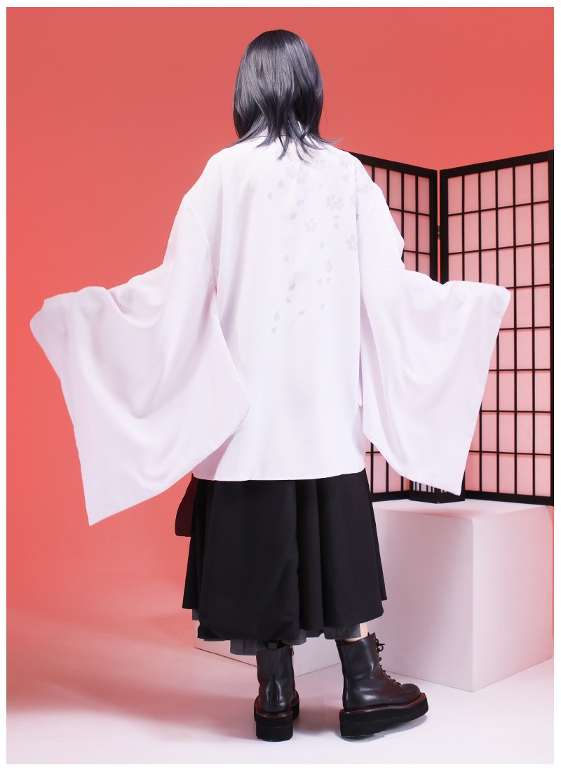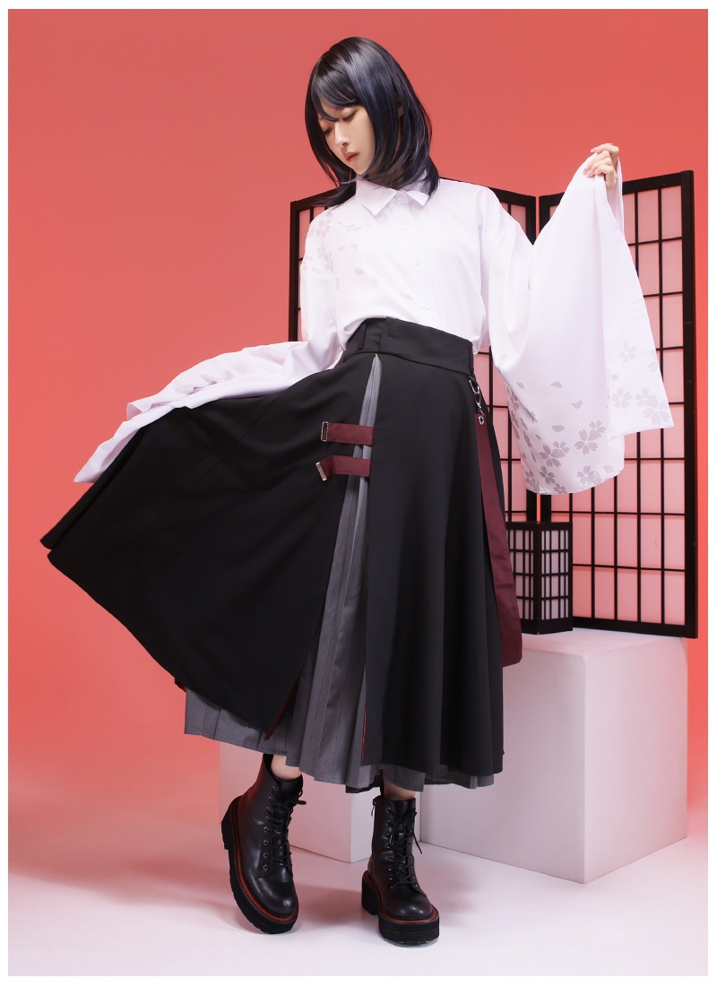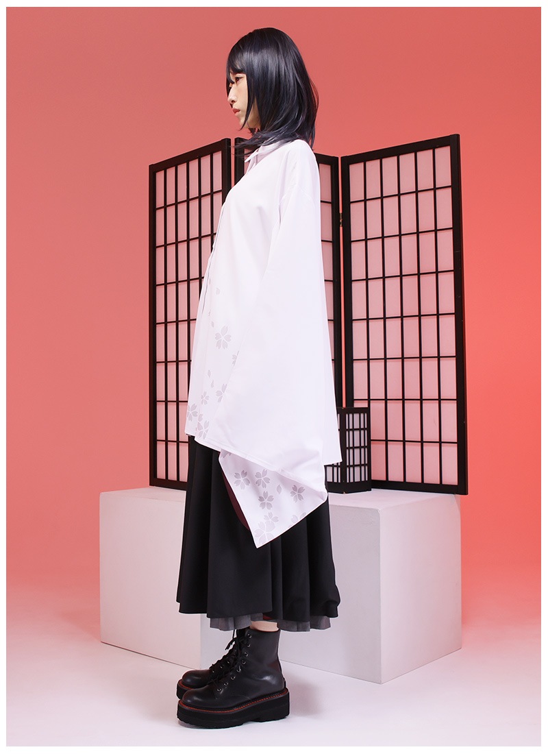 桜和袖シャツ+セットの袴風ラップワイドパンツで中性的な和洋折衷コーデの完成!