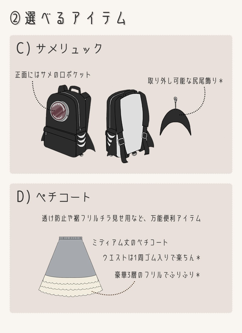 チャイナシャツに加え、【原稿用紙バッグ】【赤チェックバッグ】【サメリュック】【ペチコート】の中からお好きなアイテムも選べる*