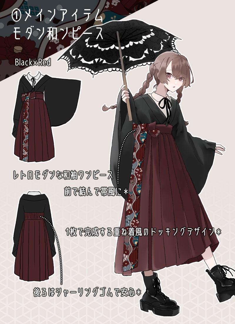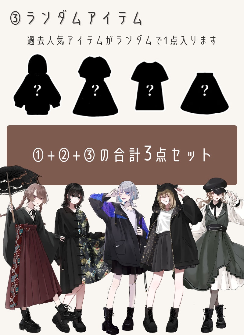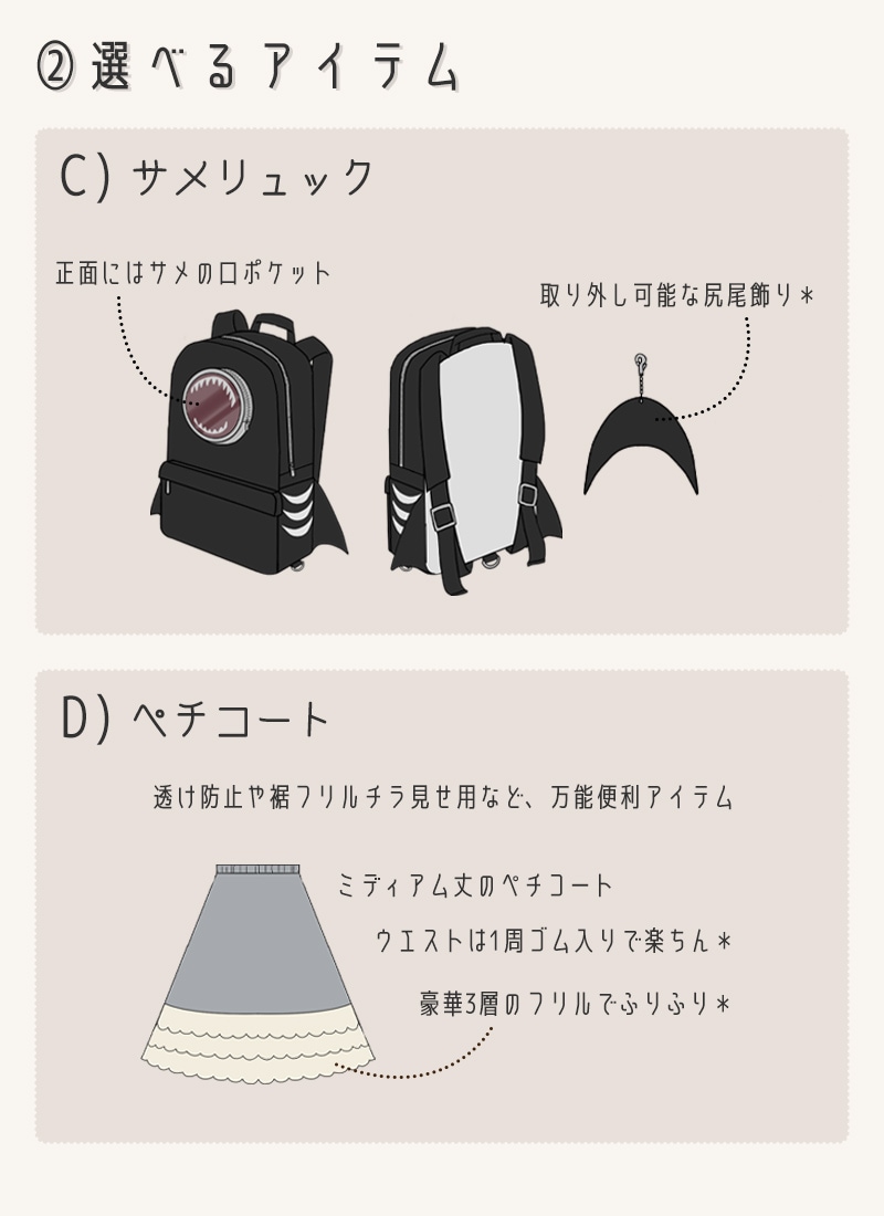 モダン和んぴーすに加え、【原稿用紙バッグ】【赤チェックバッグ】【サメリュック】【ペチコート】の中からお好きなアイテムも選べる*