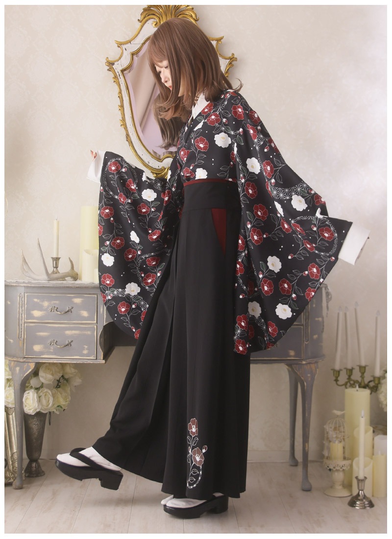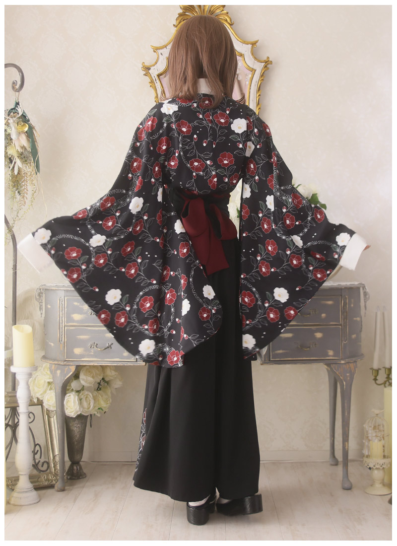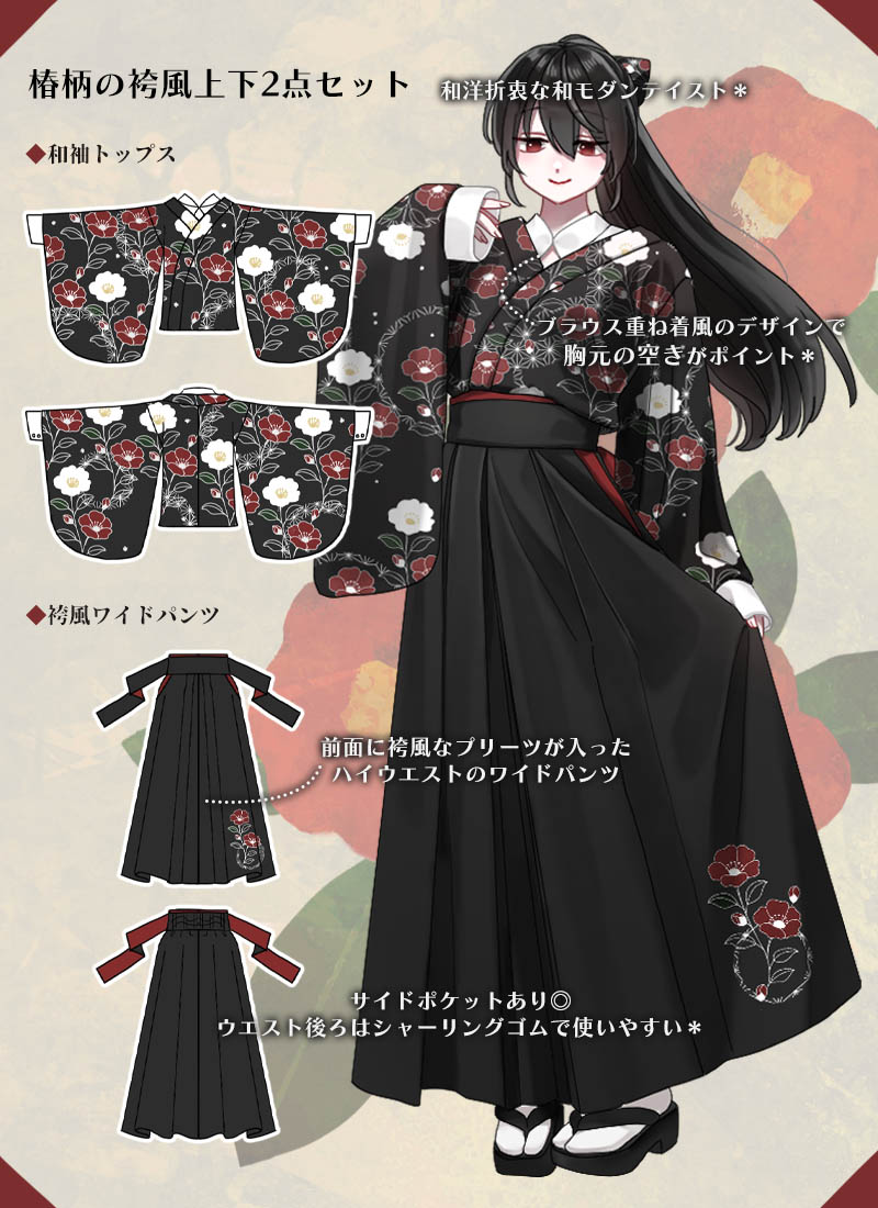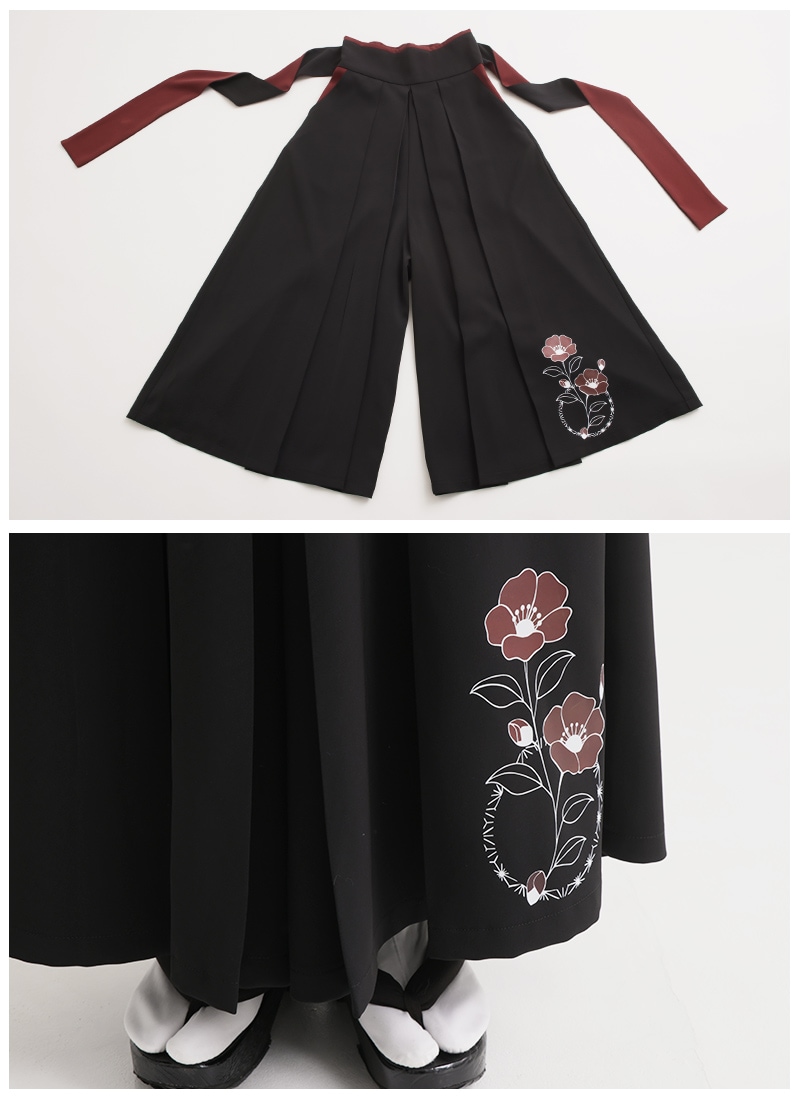 椿柄の和袖トップス&袴風ワイドパンツのコーデセット