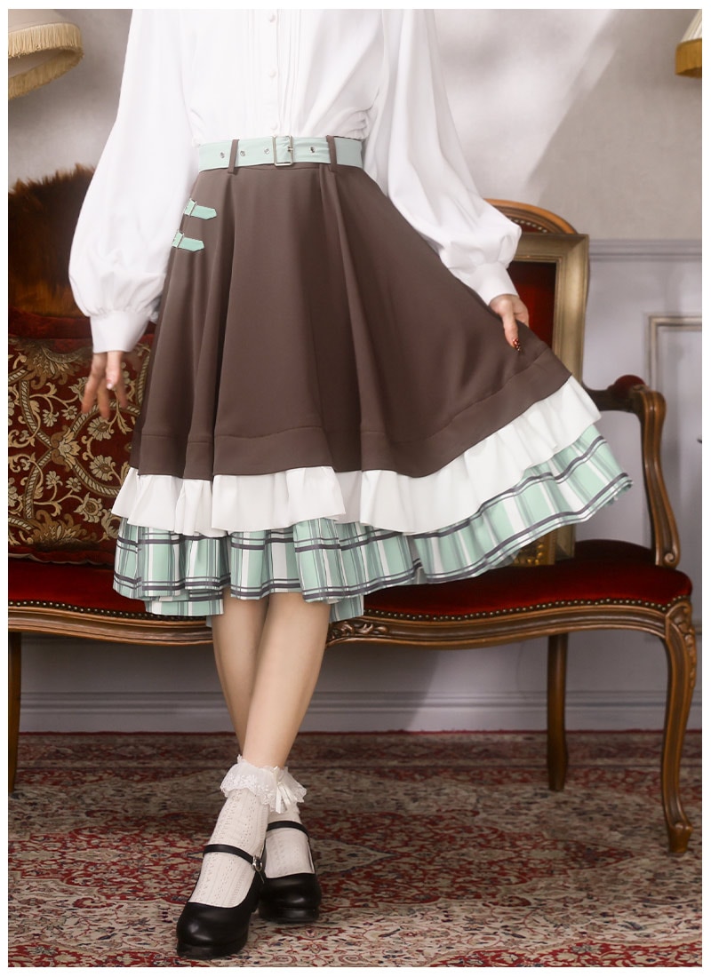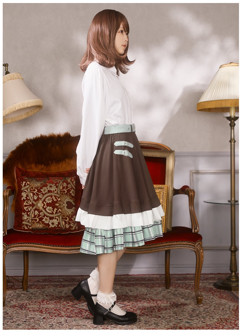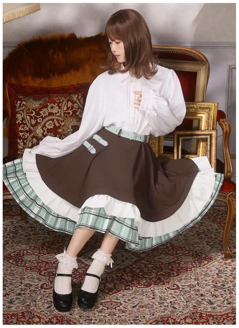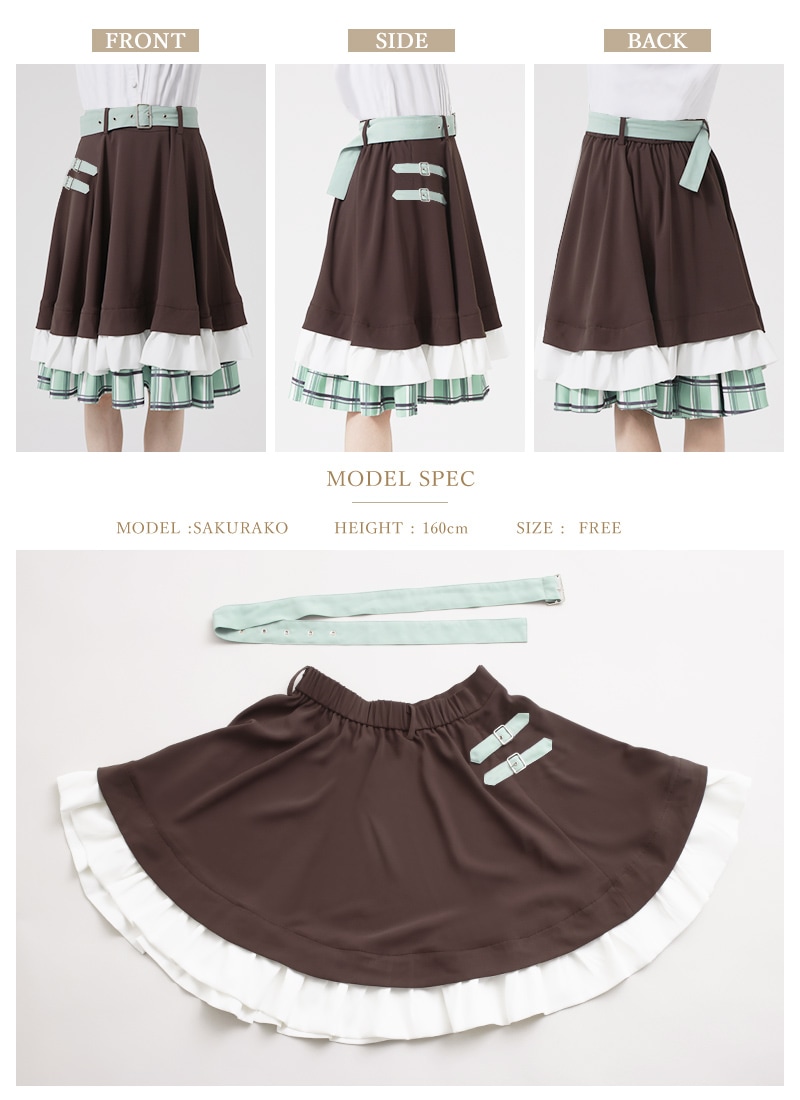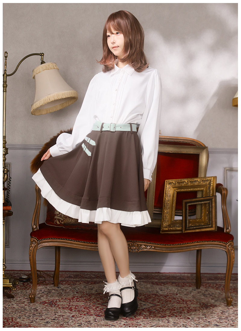 スカートは控えめベルト装飾と裾フリルのシンプルデザイン