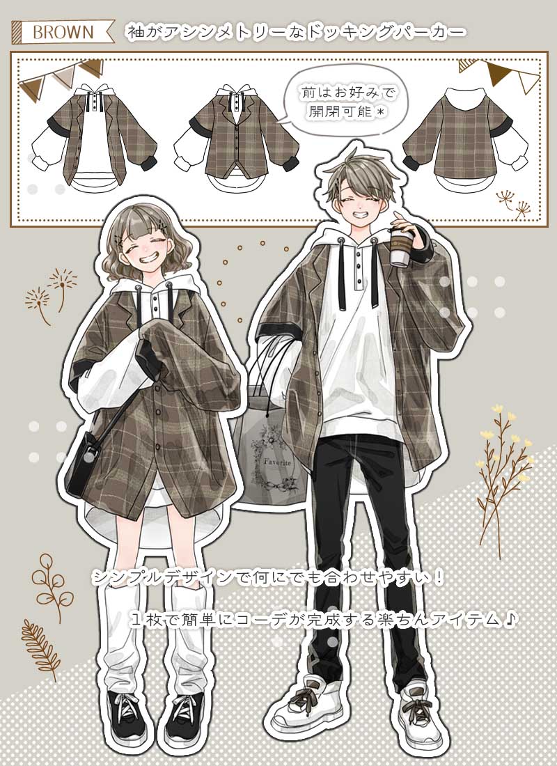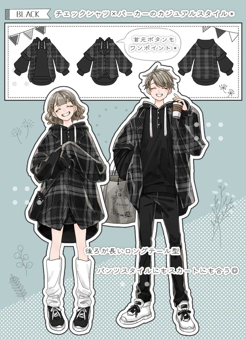 チェックシャツとシンプルパーカーを重ね着したようなデザイン、これ一枚でコーデが完成する楽ちんアイテム♪
