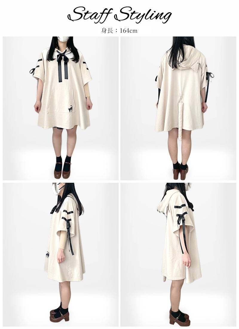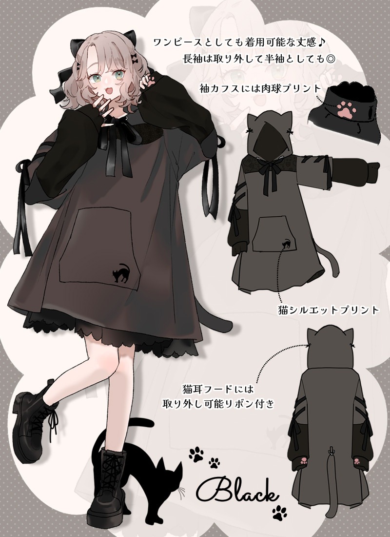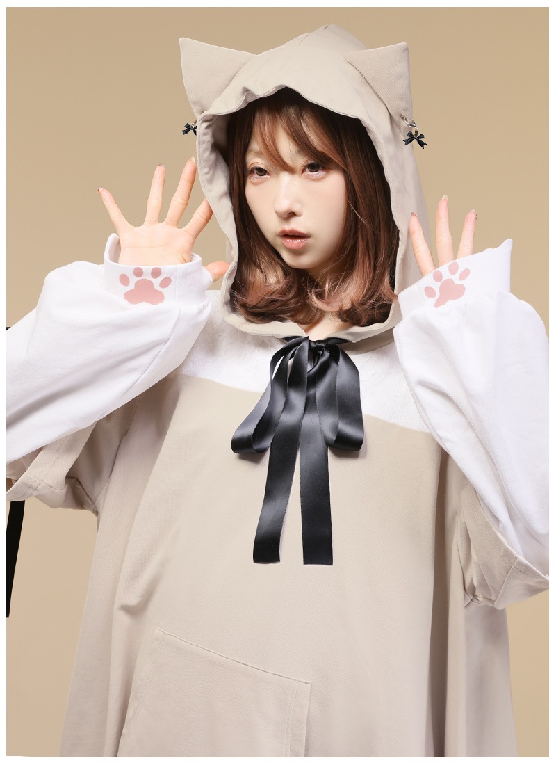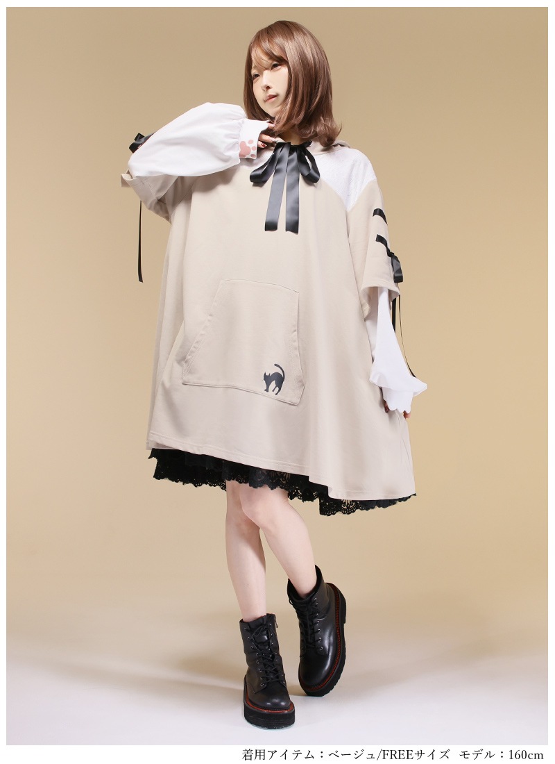 フードリボンは首輪イメージ、袖のリボン装飾は猫の柄をイメージ、そしてポケットには「やんのかステップ」している猫プリント!