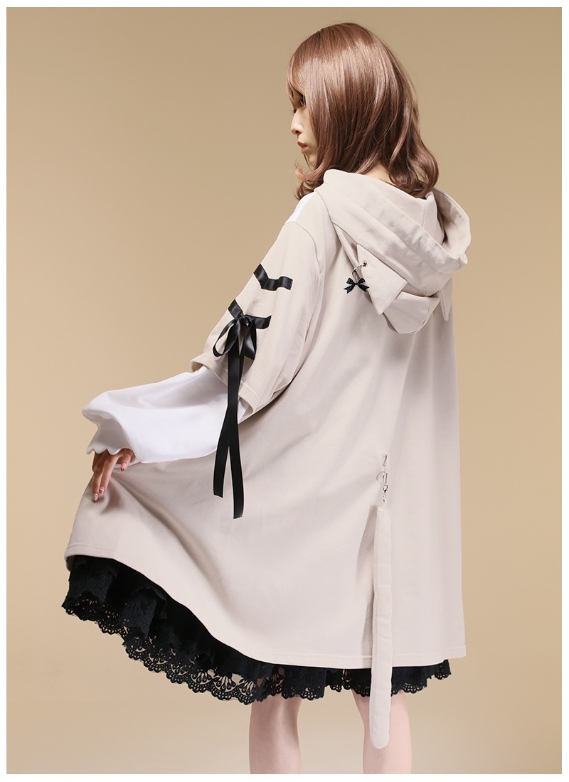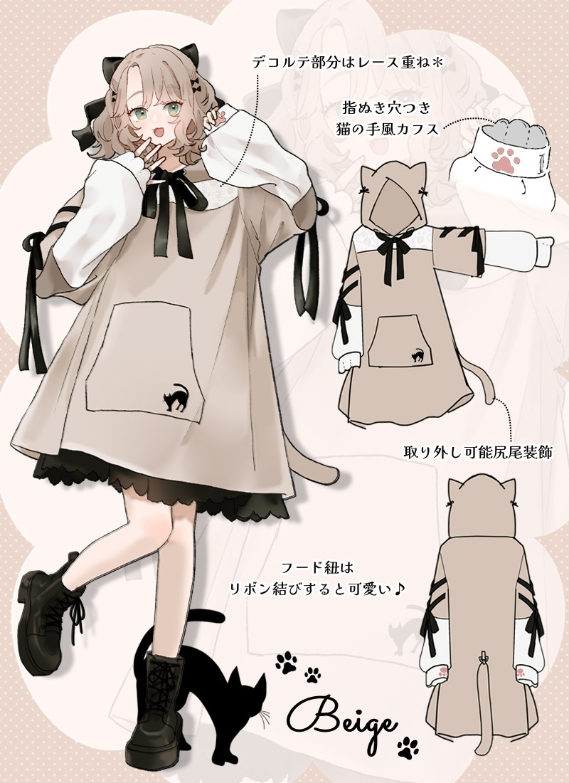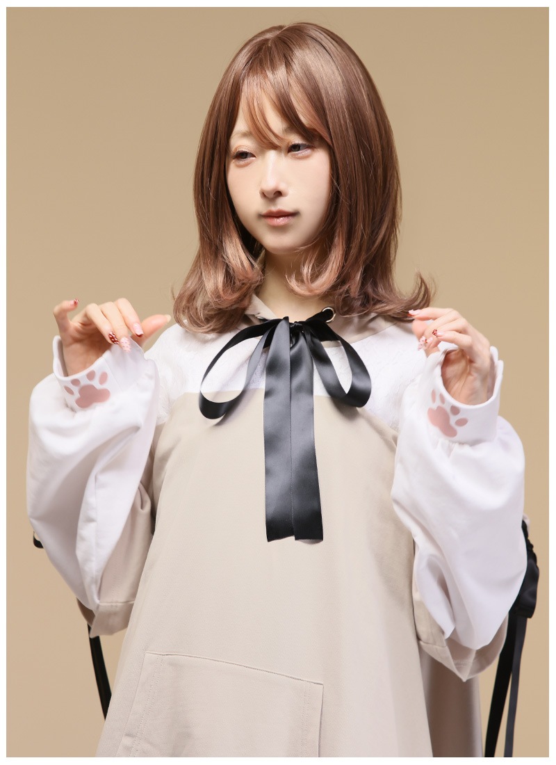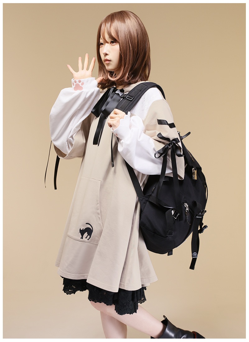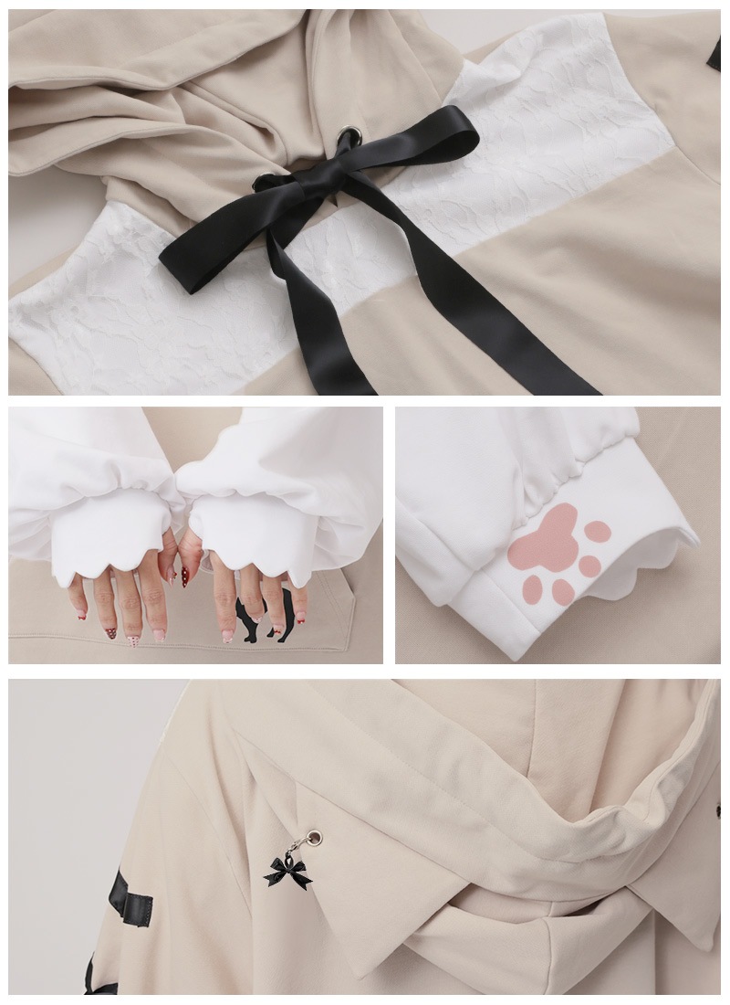 フードリボンは首輪イメージ、袖のリボン装飾は猫の柄をイメージ、そしてポケットには「やんのかステップ」している猫プリント!