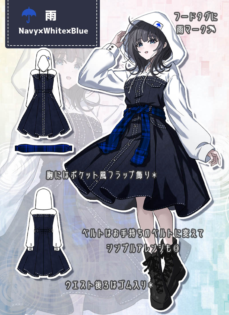 「雨」はほんのりネイビーなデニムにホワイトの組み合わせ&青チェックの差し色