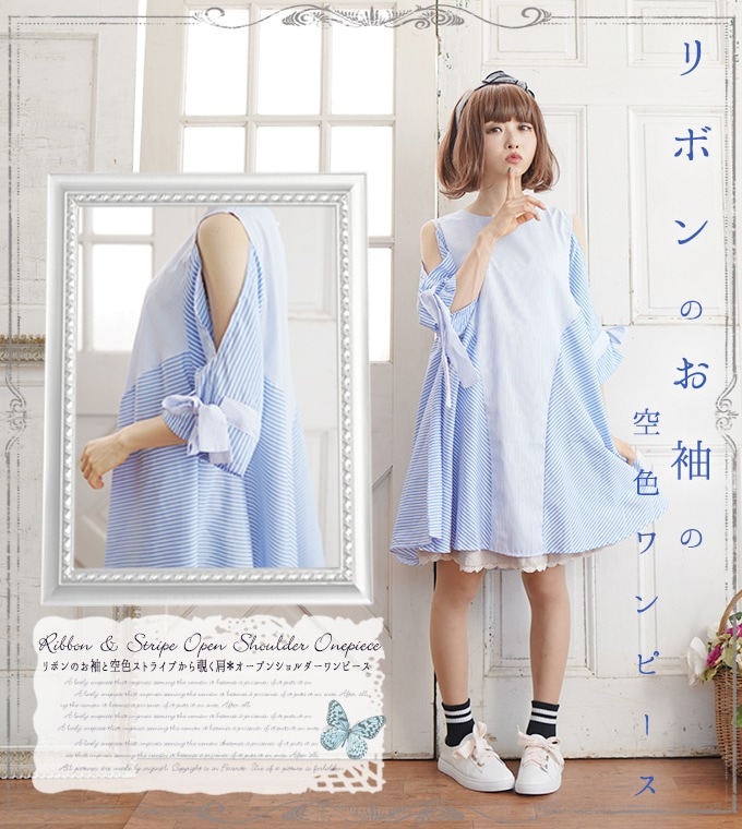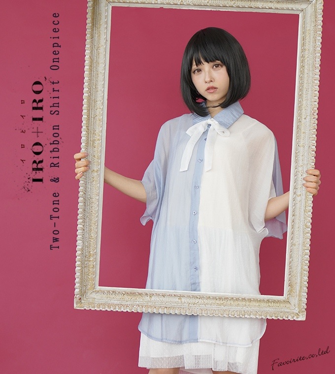 ワンピース ブルー ミディアム丈 半袖 春夏 レディース リボン ツートーン 透け感シャツワンピース ゆったり 大きめ 大きいサイズ【IRO+IRO】【2018年6月下旬予約開始】