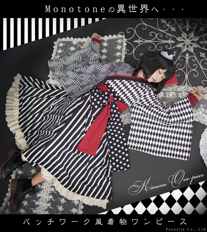 キノコ柄 きのこ ワンピース ロング丈 長袖 レース レトロ 着物 和装 和風 洋風*Favoriteオリジナル*深赤×漆黒にきのこ柄の帯が映える着物風ワンピース【2018年7月下旬予約開始】