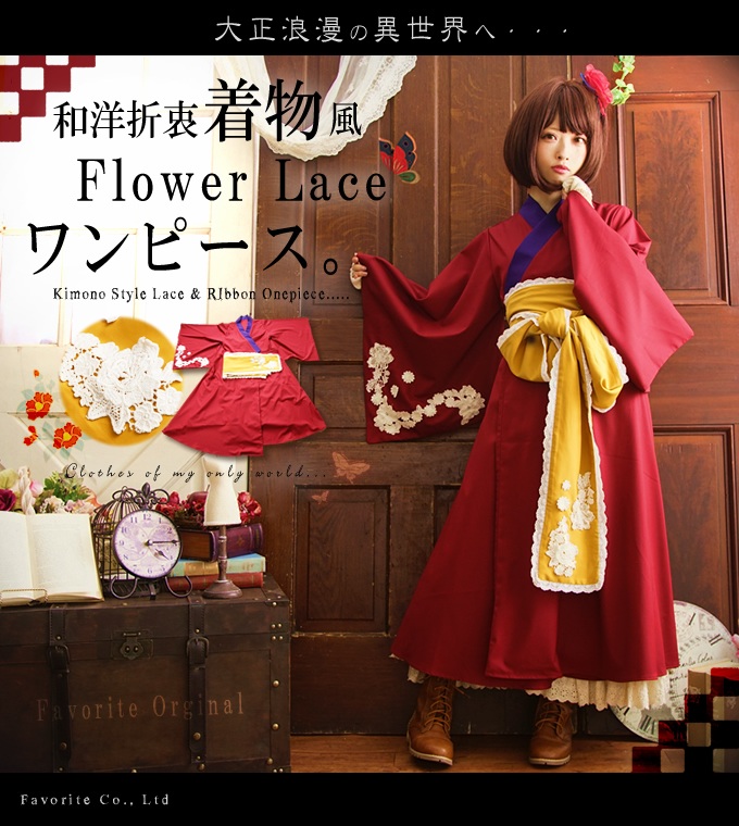 ワンピース ロング丈 ワイン 秋冬 長袖 レース 花柄 レトロ 着物 大正ロマン 和装 和風 洋風 【Sサイズ】小さめ 小さいサイズ*Favoriteオリジナル*大正ロマン袴風ワンピース