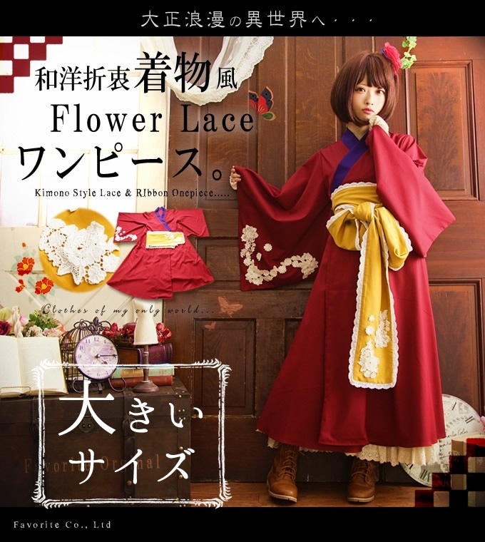 ワンピース ロング丈 ワイン 秋冬 長袖 レース 花柄 レトロ 着物 大正ロマン 和装 和風 洋風 【LLサイズ】大きめ 大きいサイズ ~13号*Favoriteオリジナル*大正ロマン袴風ワンピース