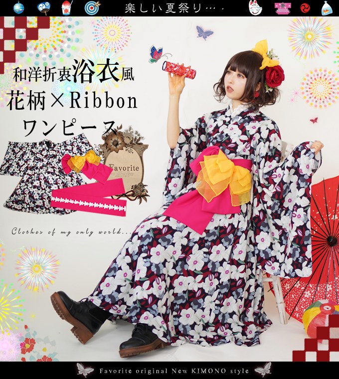 和装 ワンピース ロング丈*Favoriteオリジナル*着物 大正ロマン 和風 洋風 レースが映えるピンクの作り帯にイエローリボンを添えたレトロ花柄浴衣風ワンピース♪【2018年4月上旬予約開始】