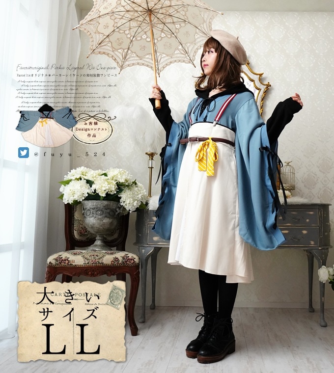 大きいサイズ LL ワンピース ミディアム丈 着物風 和洋折衷 *お客様Designコンテスト作品*Favoriteオリジナル*レースアップ袖のカジュアル着物風ワンピース【2020年4月下旬予約開始】