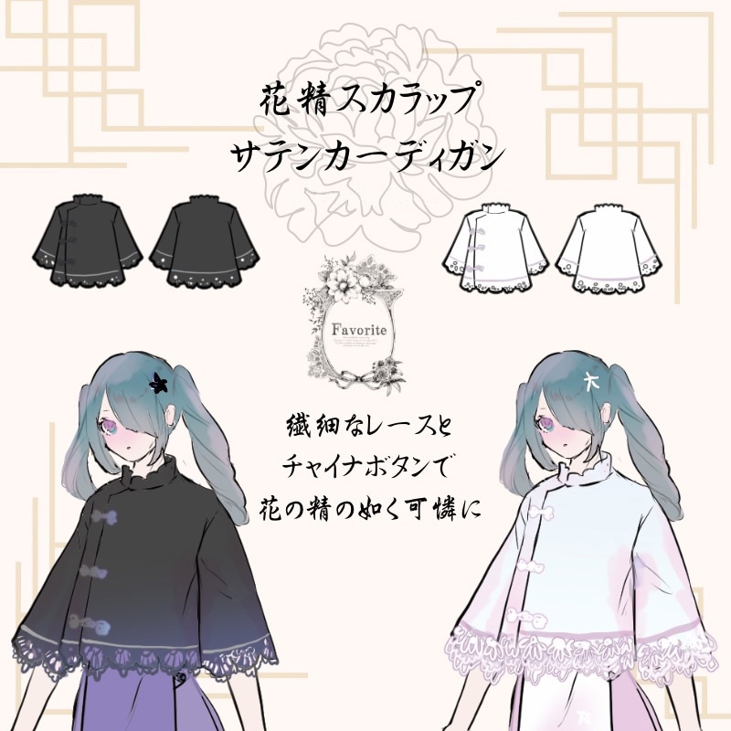 カーディガン ユニセックス アウター トップス チャイナボタン レース シンプル 中華*Favoriteオリジナル*花精スカラップサテンカーディガン【2023年12月下旬予約開始】