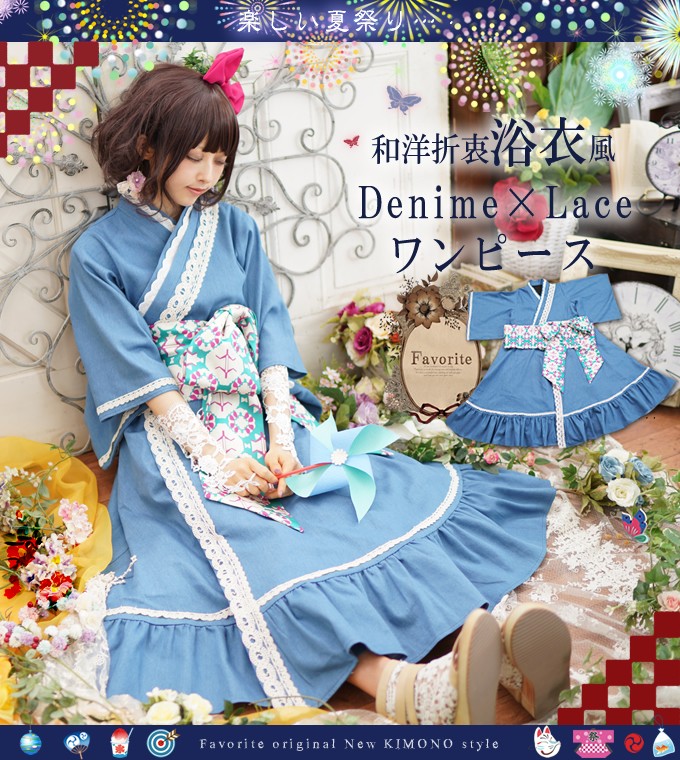 和装 ワンピース ロング丈*Favoriteオリジナル*レトロ 着物 大正ロマン 和風 洋風 グリーン&ラズベリーの作り帯が美しいデニムにレースが映える和装ワンピース♪【2018年4月上旬予約開始】