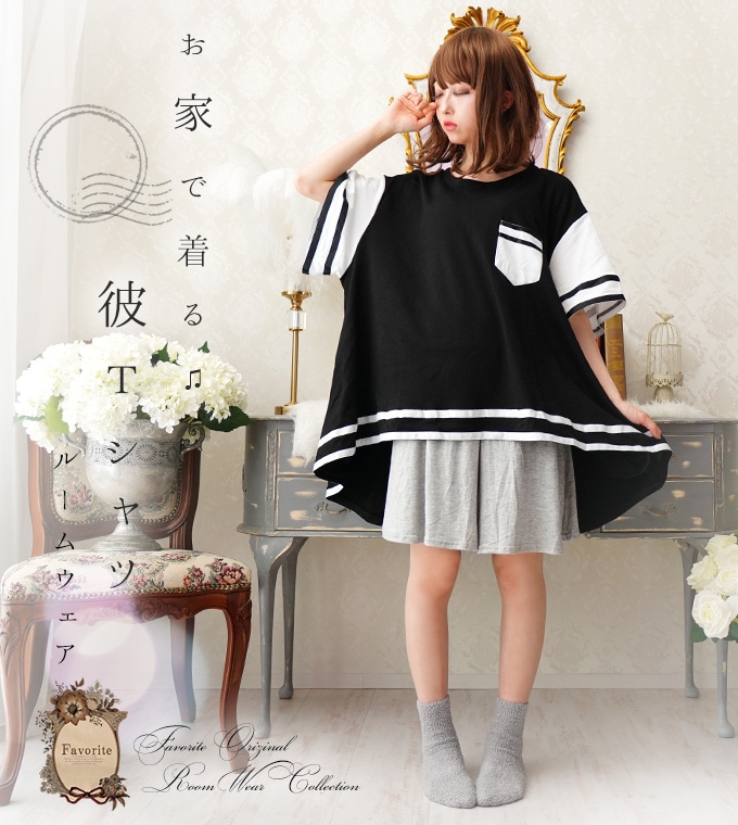 ワンピース Tシャツワンピース ユニセックス ブラック×ホワイト* Favoriteオリジナル*お家でも着れるバイカラー彼Tシャツワンピース ブラック【2020年4月下旬予約開始】