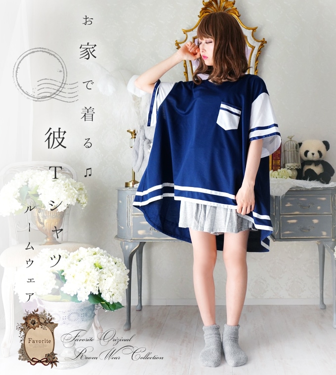 ワンピース Tシャツワンピース ユニセックス ネイビー×ホワイト* Favoriteオリジナル*お家でも着れるバイカラー彼Tシャツワンピース ネイビー【2020年4月下旬予約開始】